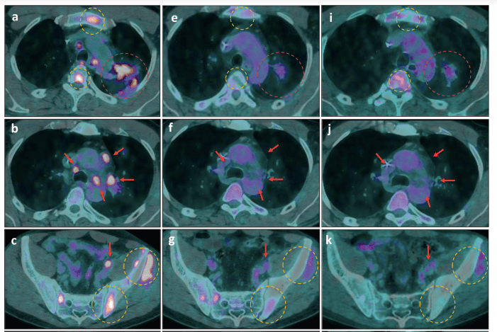 After revisiting his previous NGS report (and considering the patient´s good performance status), we prescribed dabrafenib 75mg bid, trametinib 1mg OD and osimertinib 80mg OD. He experienced remarkable pain relief within 2 weeks of treatment, with only mild treatment-related toxicities. His radiological response in the first follow-up PET-CT was impressive, with nearly 70% tumor burden reduction as assessed by PERCIST criteria (Figure 2 - panels e, f, and g). He remained progression-free until October when mild progression occurred. Throughout his entire treatment, longitudinal ddPCR ctDNA assessment demonstrated its interesting and useful concordance with PET-CT scan, which underscores this methodology´s potential to anticipate imaging findings.