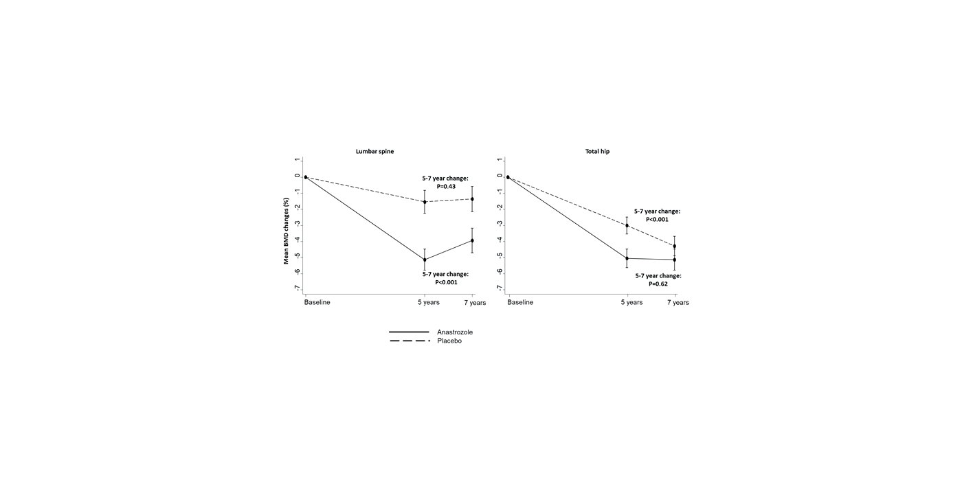 In our current analysis [8], we wanted to see whether the decrease in BMD stops after women have ceased with anastrozole (between years 5 and 7). We found that in women who had normal BMD at baseline (no risk of developing fractures) and did not receive any bisphosphonate treatment during the trial, BMD between years 5 and 7 had a significant increase in BMD at the lumbar spine (increase of 1.25% (95% CI 0.73 to 1.77; P=0.0004). For those who received a placebo for 5 years there was hardly any improvement in BMD between years 5 and 7. There were no substantial changes in BMD seen at the total hip.