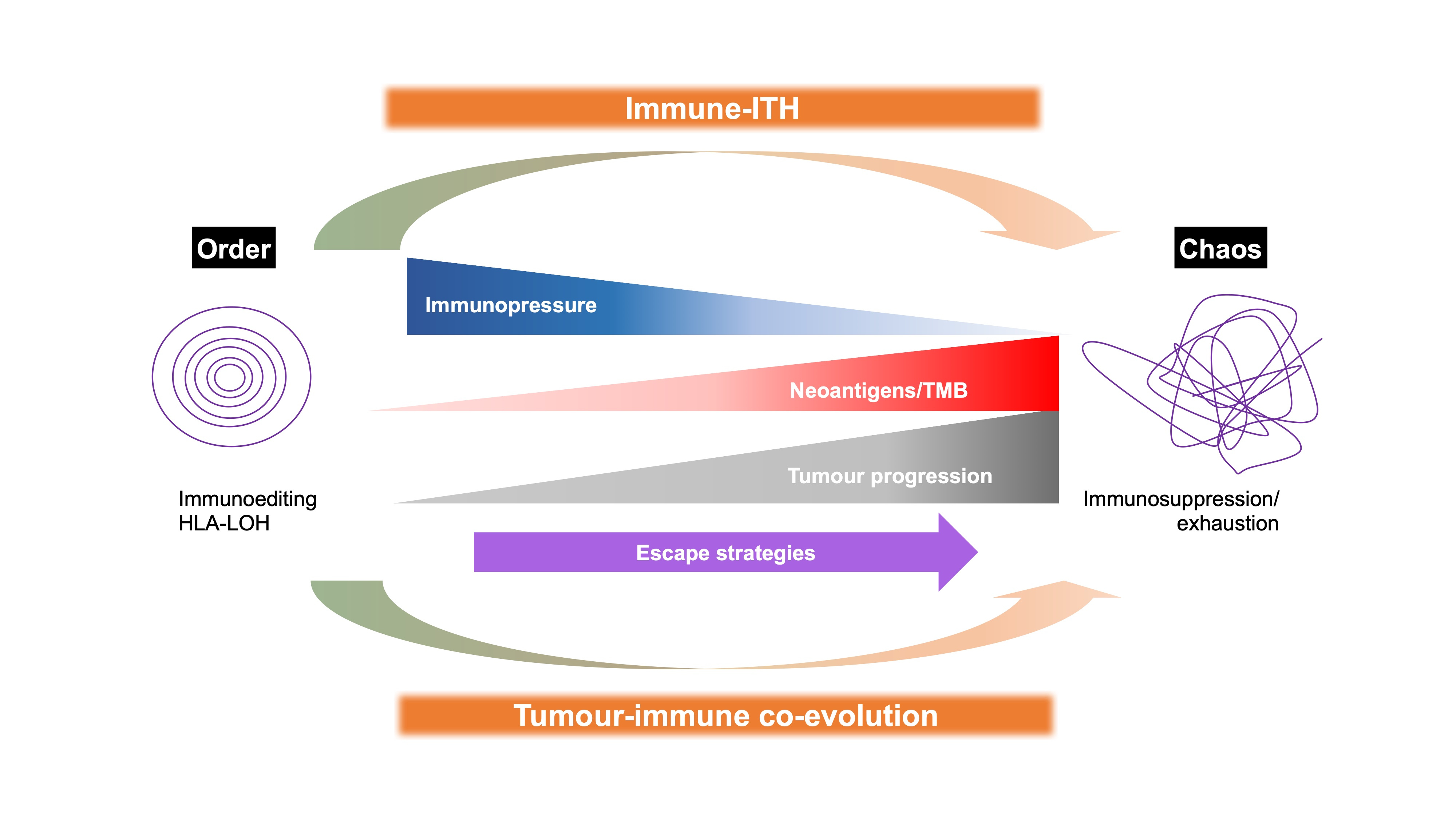 The euphorically moment came when we successfully showed, even with the data from less than 20 patients, a strong relationship with tumour mutation burdens, particularly with the neoantigen loads, and the tumour progression in terms of shorter recurrence-free survival in patients with higher immune-ITH. Our collaborators then started to express their keen interest and took our theories seriously. At this point, we could say the rest is history, but not quite yet. We went into a lengthy process to robustly test our hypothesis by including more patients: 28 patients with a total of 95 tumours sectors from our cohort as well as two external public HCC cohorts. We also examined other parameters to explain this immune-ITH phenomenon, discovering how this “co-evolution” was driven by a stronger immuno-selective pressure at earlier stage of tumours, which eventually escape via immunoediting and losing the antigen-presentation capability that finally resulted in immune-ITH, immunosuppression and tumour progression (see figure).