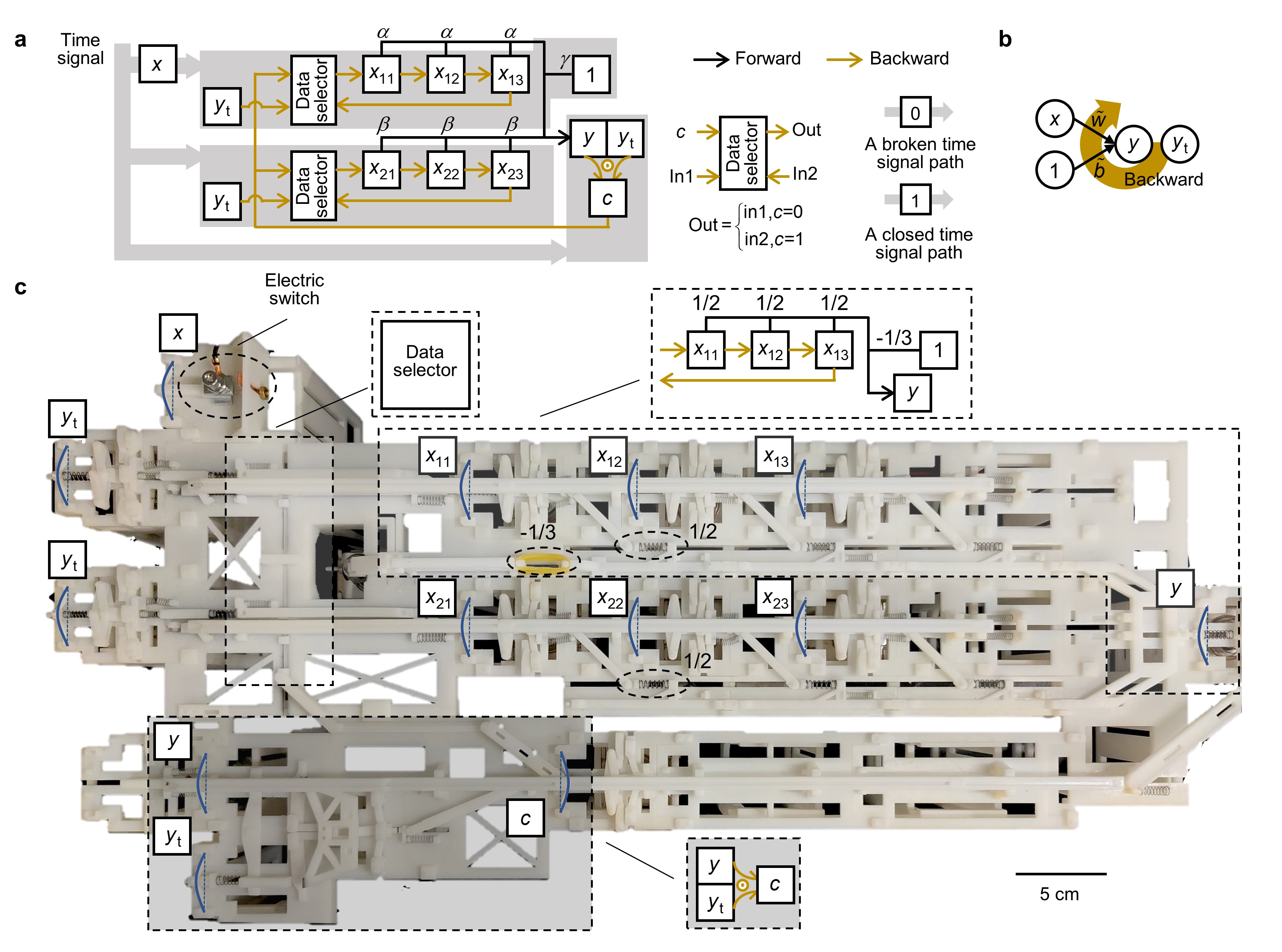 As for the mechanical self-learning perceptron model, it has a forward propagation procedure represented in Fig. 3a (black interaction symbols). The forward procedure of the mechanical self-learning perceptron matches that of the Rosenblatt perceptron (Fig. 3b). Furthermore, the backward propagation procedure of the mechanical self-learning perceptron is represented by the interaction symbols in brown in Fig. 3a. Once the corresponding mechanical memory units receive the time signal, they evolve according to the result c of XNOR under the control of the data selector. A fully functional mechanical self-learning perceptron was 3D printed and demonstrated (Fig. 3c). The functions of some typical components are marked. The mechanical self-learning perceptron can acquire target input-output relationships under a supervised learning manner.