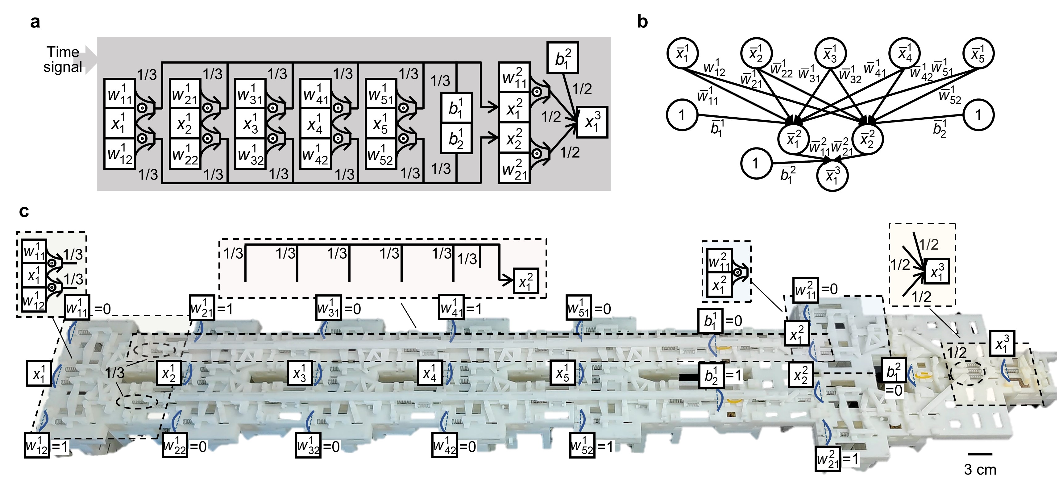 Fig. 2 Mechanical binary neural network. a A mechanical binary neural network with an input, a hidden, and an output layer. b An equivalent binary neural network of a. c The mechanical binary neural network in the experiment.