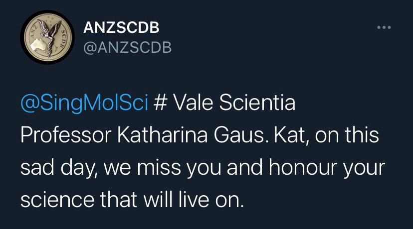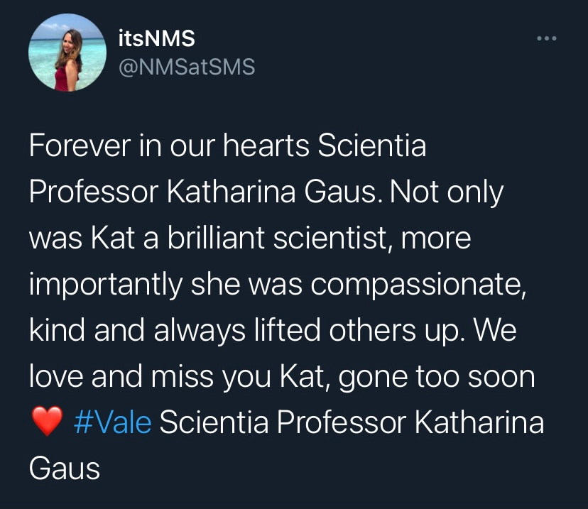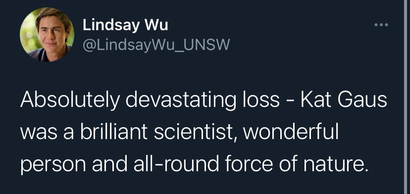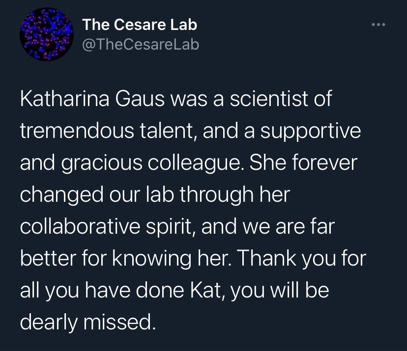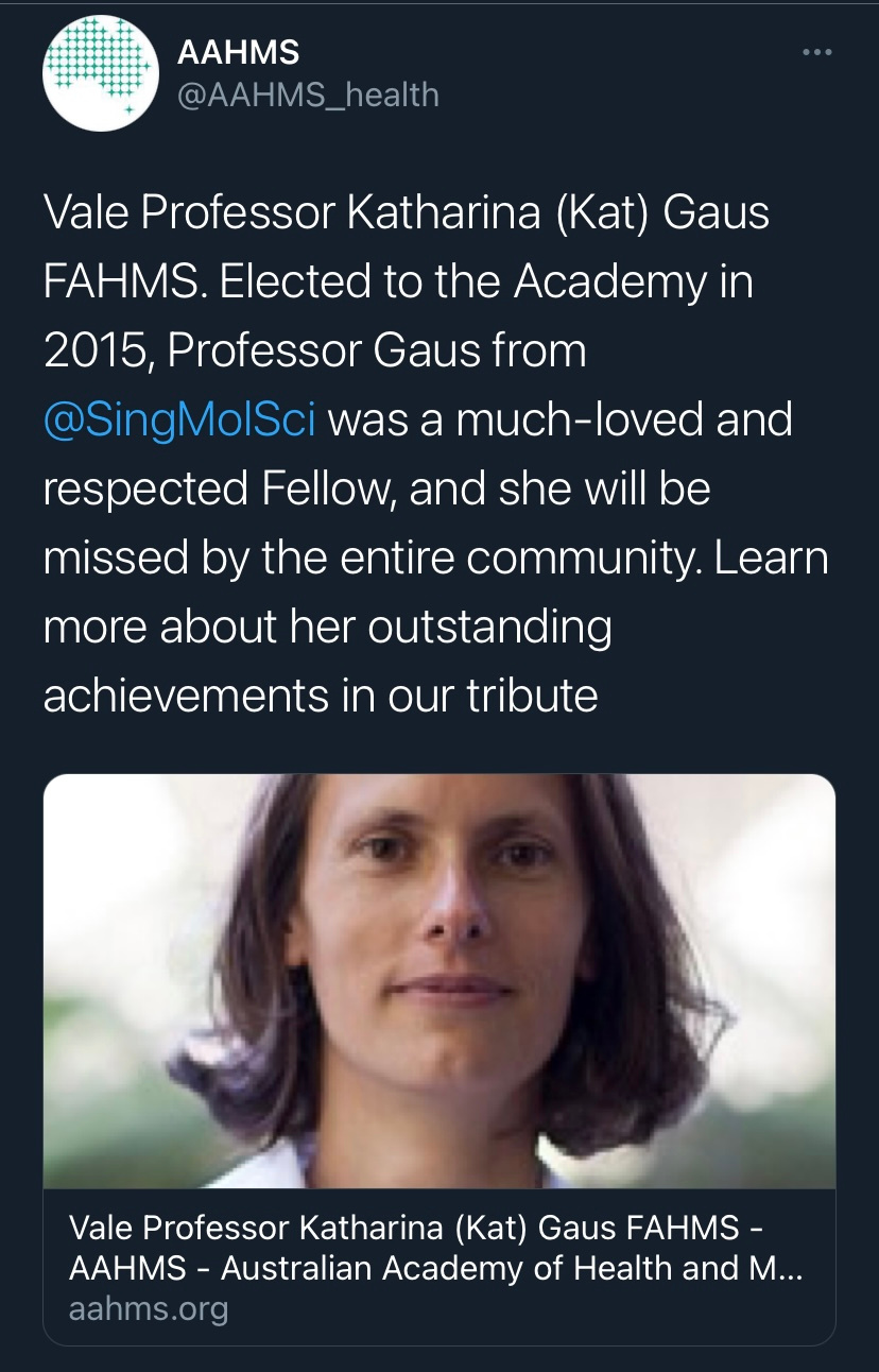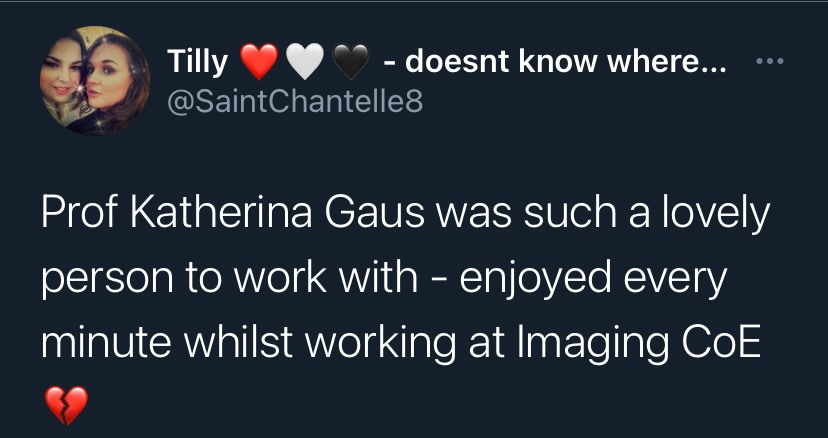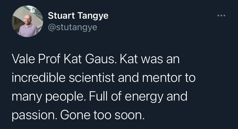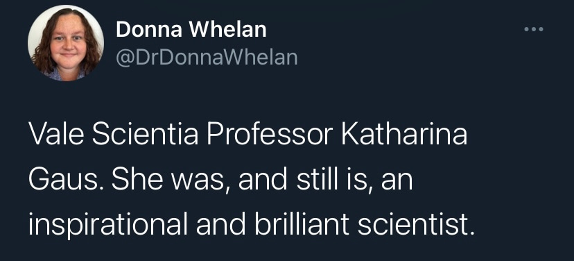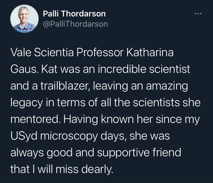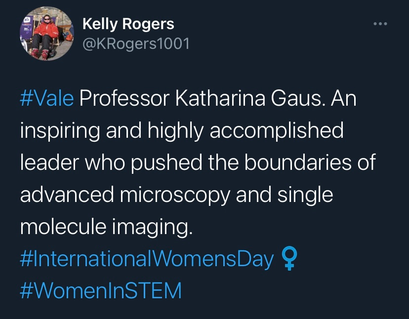 It is with deep sadness that I write this tribute to Katharina Gaus – Kat to those who knew her. I would not be where I am today without her support and guidance, but I am by no means unique in this as Kat was a fantastic mentor to so many. Kat was a highly ambitious and successful scientist, but what really set her apart was how extremely generous she was with her support. She had a passion for building the careers of junior researchers and was so often more focused on selflessly creating opportunities for those around her rather than aggrandising her own career. Moreover, the way in which she provided support firmly reflected how much she valued diversity. Where so many just talk the talk on this issue, Kat truly walked the walk. If she believed a junior colleague had a contribution to make to science, rather than mould them into her own image, she would give them space and support to grow into the researcher they wanted to be. In my experience these are uncommon traits in those that have reached the pinnacle of their profession.