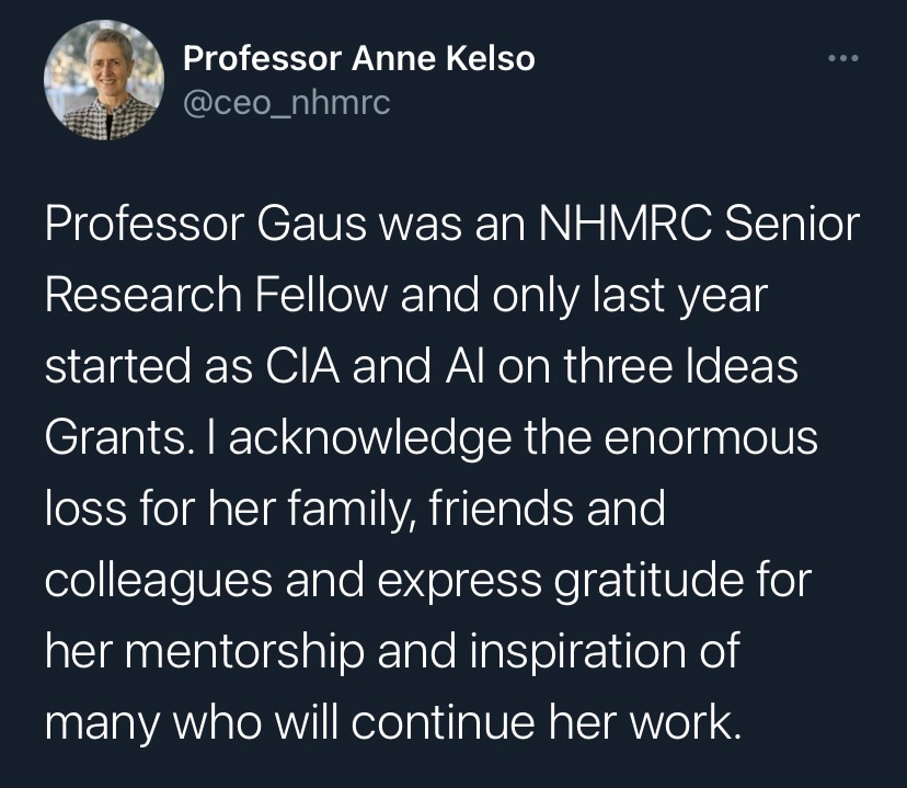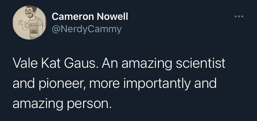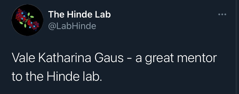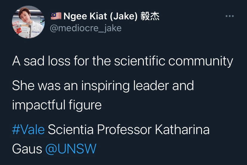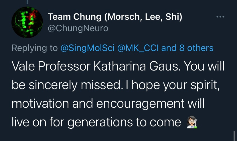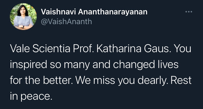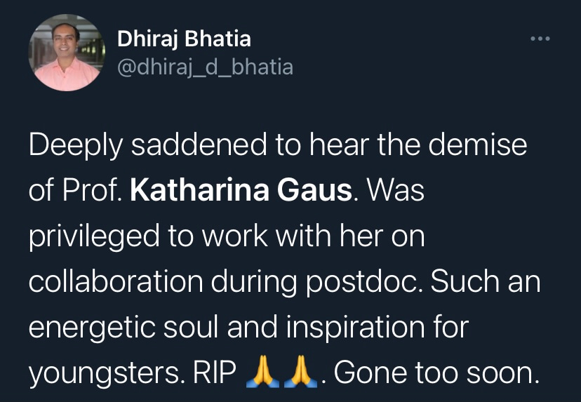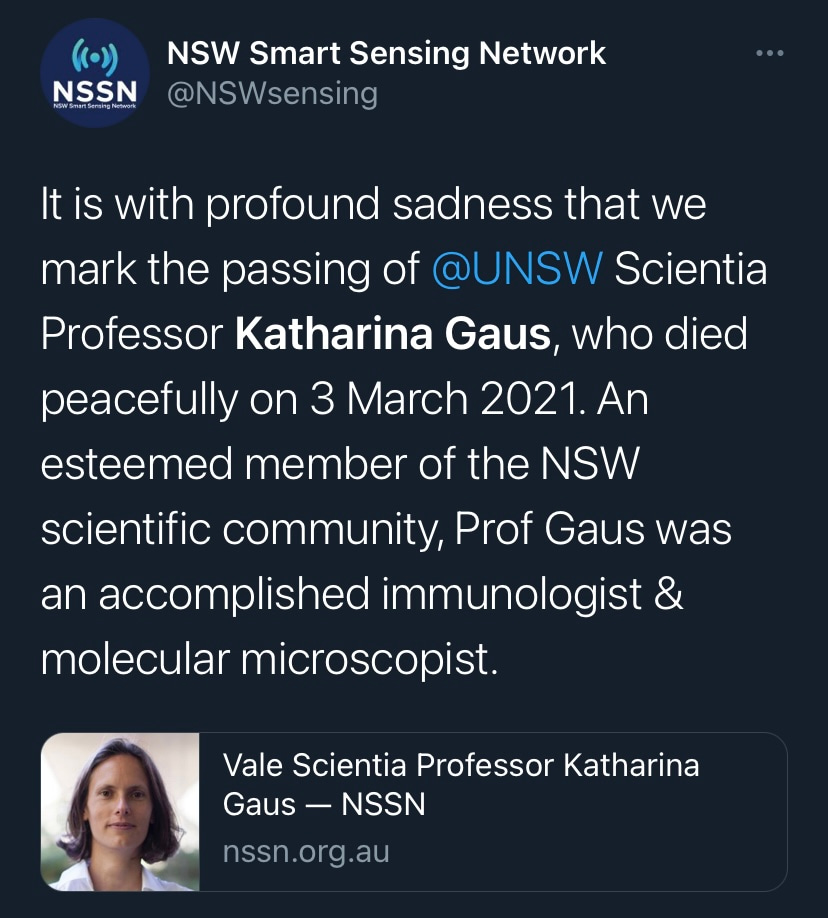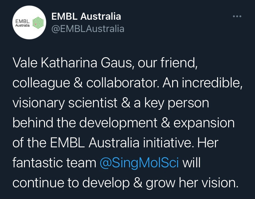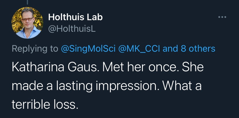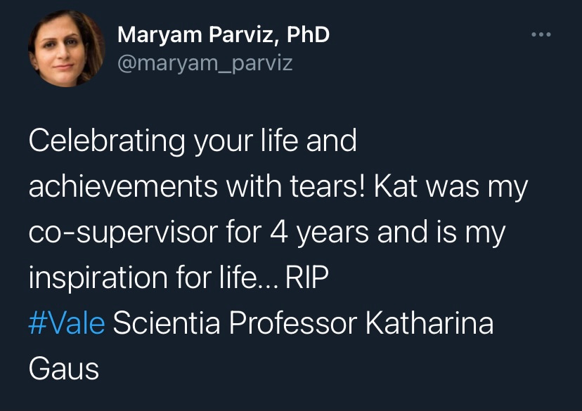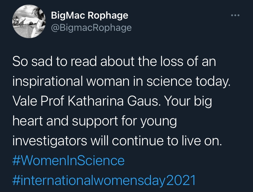 It is with deep sadness that I write this tribute to Katharina Gaus – Kat to those who knew her. I would not be where I am today without her support and guidance, but I am by no means unique in this as Kat was a fantastic mentor to so many. Kat was a highly ambitious and successful scientist, but what really set her apart was how extremely generous she was with her support. She had a passion for building the careers of junior researchers and was so often more focused on selflessly creating opportunities for those around her rather than aggrandising her own career. Moreover, the way in which she provided support firmly reflected how much she valued diversity. Where so many just talk the talk on this issue, Kat truly walked the walk. If she believed a junior colleague had a contribution to make to science, rather than mould them into her own image, she would give them space and support to grow into the researcher they wanted to be. In my experience these are uncommon traits in those that have reached the pinnacle of their profession.