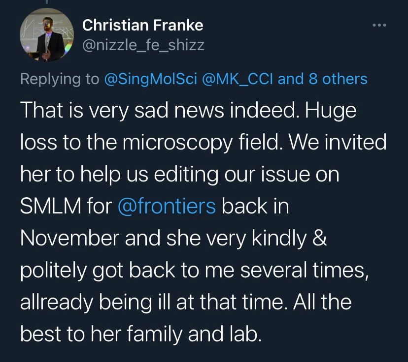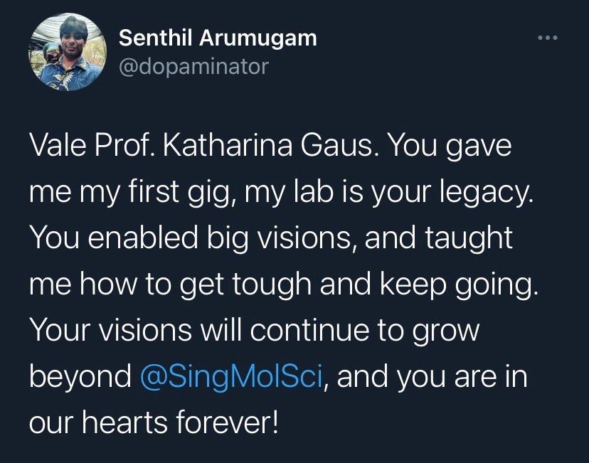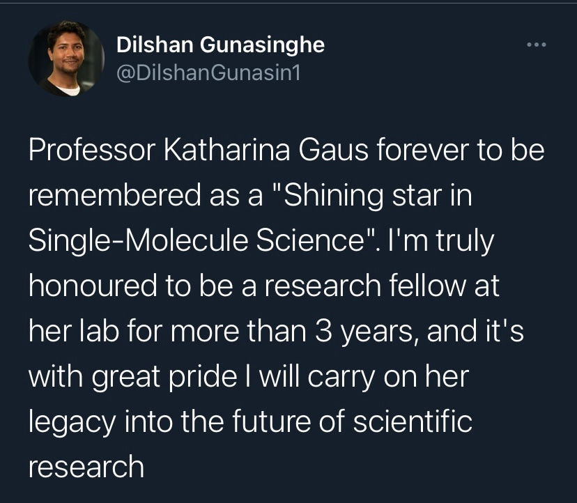 After graduating as a chemist and taking a rather peculiar route to biomedical research, I stumbled upon Single Molecule Science (SMS) at the University of New South Wales (UNSW) in Sydney and was strangely fascinated by the extent of super-resolution microscopy applications and its utilisation in biological research. It was simply “seeing is believing” and at the heart of it was Professor Katharina Gaus. As a world-renowned scientist, she was at the frontier of bridging physics and biological sciences and pushing their boundaries to better understand our immune system. Her work in T cell biology, in particular visualising and understanding the early stages of T cell activation, which then initiate adaptive immune responses marked the culmination of her interdisciplinary research. This remains to be a perfect example of her vision to push the limits of current technology to unravel the mysteries of cellular functions. I was tremendously fortunate to work in her lab as an early career researcher for more than three years (2018-2021). It was always in her nature to support budding scientists and guide them towards thinking “outside the box”, a necessary quality to be developed by many of us that is not limited to tackle difficult questions in science but also to boldly face perils in life. The vision of Professor Gaus extended beyond Science. The flourishing culture she created within the institution of SMS is a testimony to her tremendous capacity as a great human being. I have no doubt that these qualities of Professor Gaus have nurtured a whole new generation of young scientists like myself and I will strive to emulate her professionalism throughout my research career. Vale Professor Katharina Gaus, you are forever to be remembered as a shining star in Single-Molecule Science.