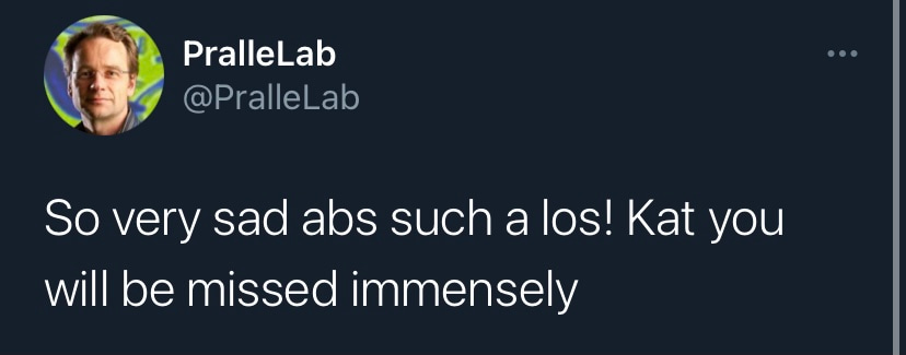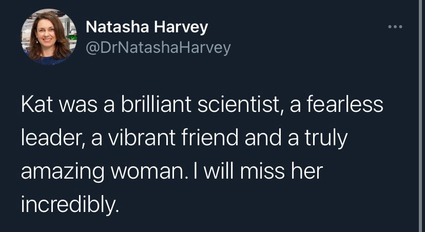 One of my team members told me her abiding memory of Kat, was Kat and I walking ahead, side by side, talking passionately about science, totally focused on each other. I like that imagery. As I now walk alone I imagine Kat talking to me, helping to guide me, helping to make me braver and more generous to others and helping me to change our world to allow others to thrive as we have. I only hope I can stay true to her legacy and make her proud.