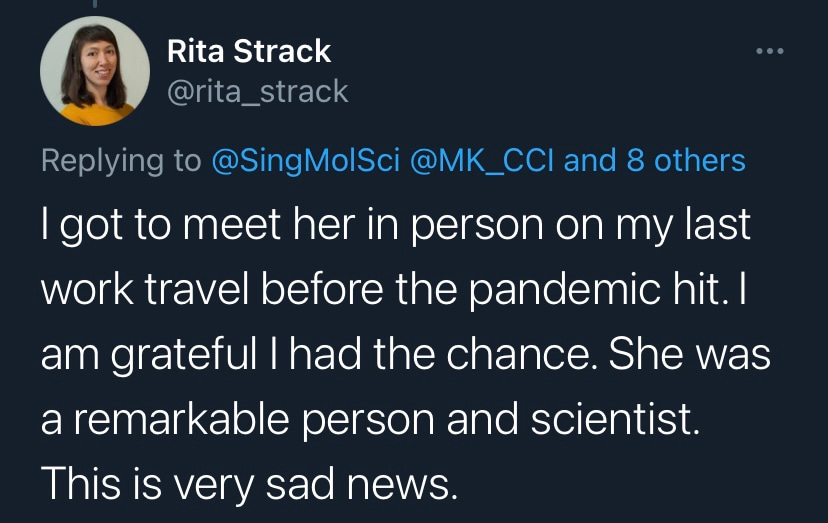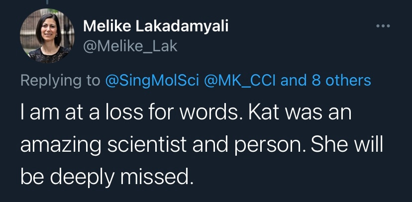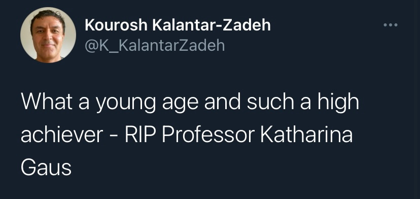 I finally met Kat in person in early 2020, just before the coronavirus pandemic brought all business travel to a halt. She and her colleagues at the Single Molecule Science Centre hosted me for a visit at UNSW Sydney. It was immediately clear from meeting with the scientists there what her vision was for this diverse and talented group of scientists and what a lasting impact she was already poised to make. It was at that in-person meeting where I was also able to get a glimpse of her as a person. She was quick to smile and laugh and spoke very lovingly of her family. My deepest condolences are with them now.