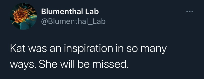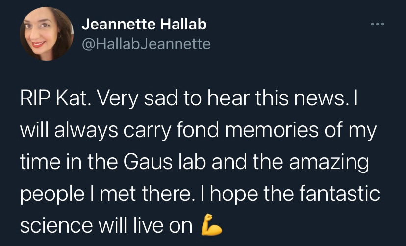Kat’s quality as a leader in combination with her inquisitive mind led her to create an international network of collaborators, colleagues and friends. Her spirit, her passion for science and her sharp intellect left a lasting impression not only on the many students and postdocs she trained and mentored. Her legacy will be carried on in the hearts of the countless lives she has touched. Kat will be greatly missed.