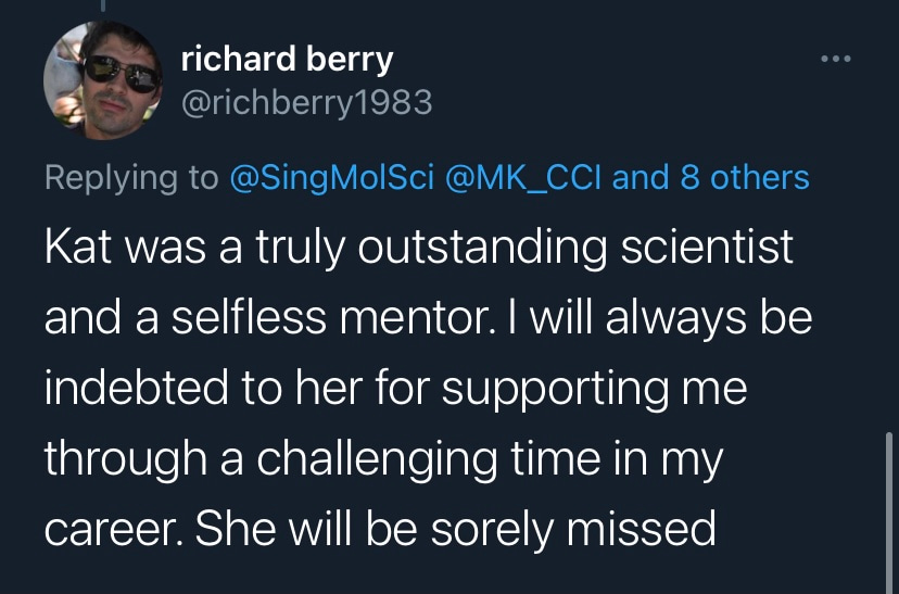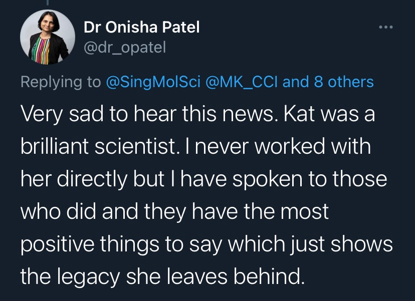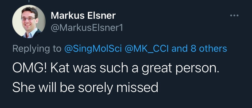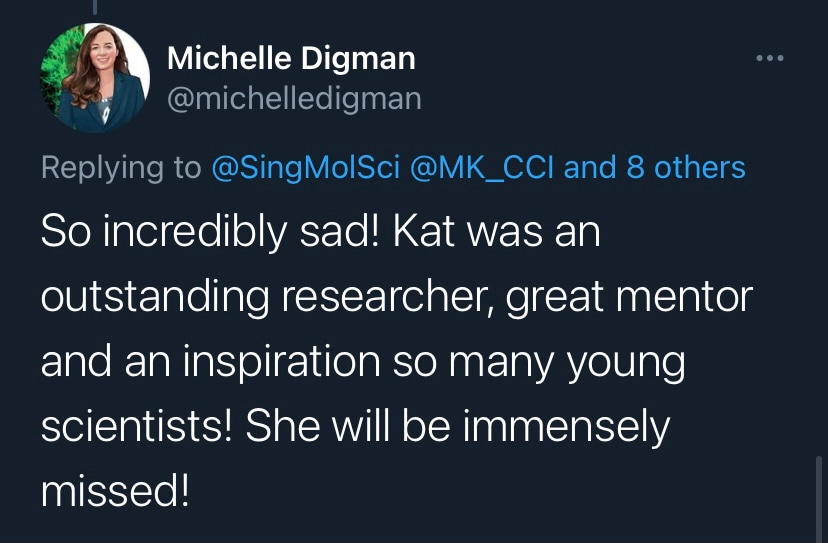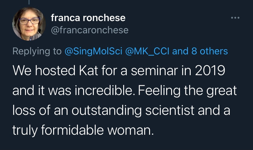 I am very privileged to have worked with Kat to expand SMS by recruiting group leaders, staff and students; and to design new initiatives and strategies to improve research. Kat was an extraordinary leader, supervisor, mentor and friend. She will be missed immensely.