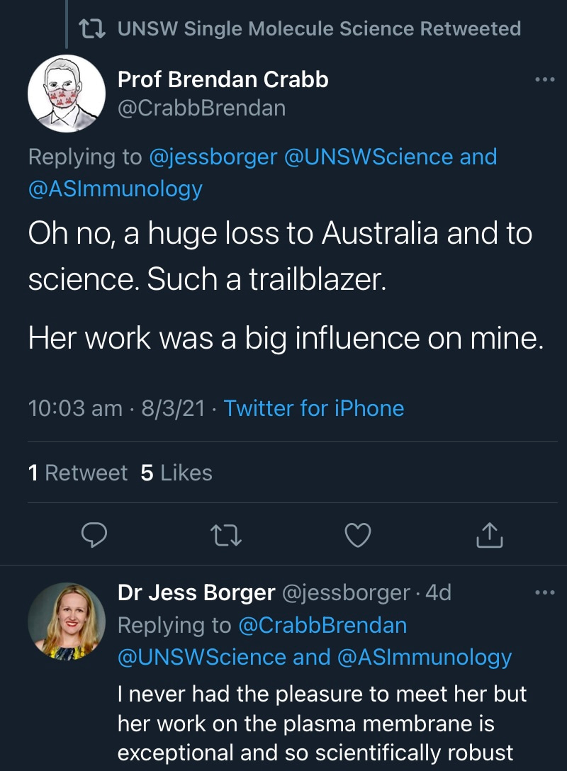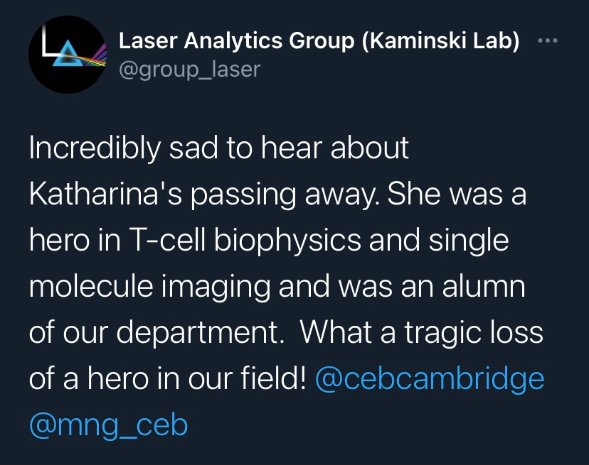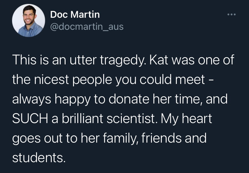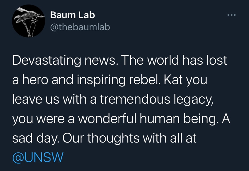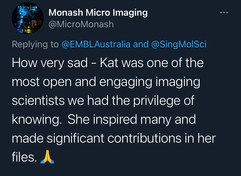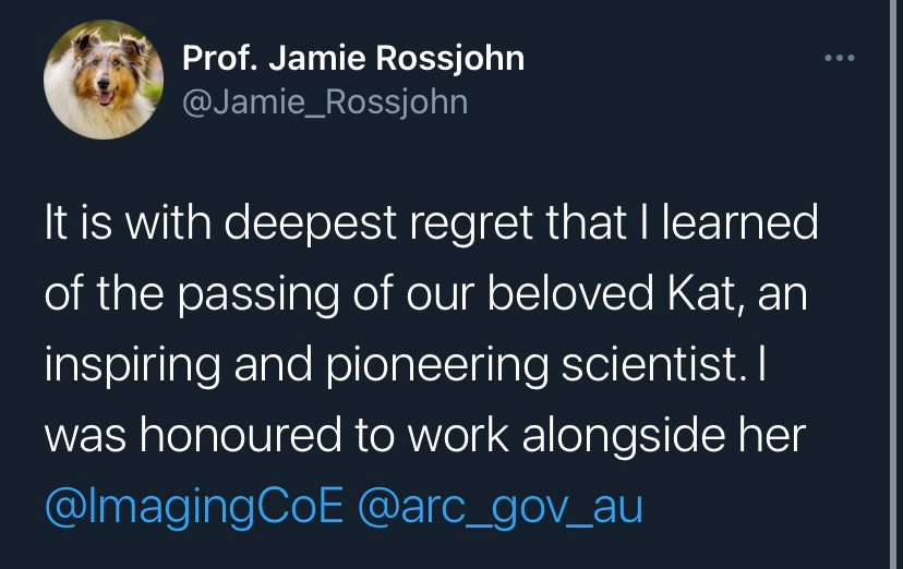 I first met Kat in 2017 a few months before I joined Single Molecule Science at UNSW. Our paths had never previously crossed. Our fields of interest barely intersected. I was a structural biologist and virologist, Kat a renowned T-cell expert and microscope builder. Yet at our first meeting, it was clear that Kat was someone who would go above and beyond to fight for me. Why? I’m not sure I’ll ever really know, but it was the greatest gift I have received in my professional life. As I grew to know Kat over the following years, it was clear that I was not alone. Those who worked at SMS didn’t just have a line manager, colleague, mentor and friend, they also had their very own champion. While Kat’s scientific achievements are undeniable, I will remember her as someone with a seemingly unique ability to enable those around her. While the untimely loss of a mentor and friends can be incredibly hard to comprehend, especially when so many had so much more to learn from her, I know that those who knew her will carry on her legacy of championing visionary science. Vale Kat.