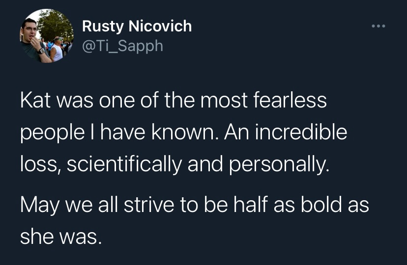 Many in the field will be familiar with how Kat pushed the limits of technology to develop new methods, but she also pushed against barriers that held people back. She did this usually with little reservation. She frequently pushed back against ‘the establishment’, challenging them to do better. Kat was always striving to be better and make the environment better for everyone.