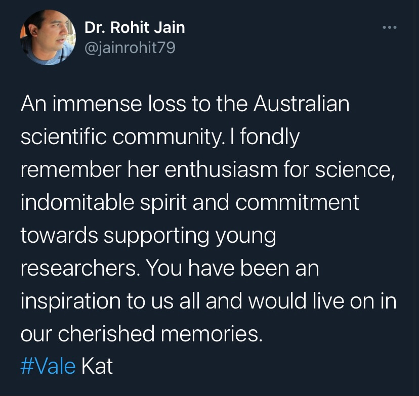 Kat played the boss when required and played the mentor at other times. My years with Kat certainly taught me to toughen up, and keep doing what one is supposed to do, irrespective of whatever may come on the way. I learnt, through watching her make decisions, managing goals as a small specialist department, discussing aspects of managed-science vs curiosity-driven science, to think beyond oneself, and how one can choose to play the leader for larger goals. Kat put herself forward for leading in endeavours that were not traditional and saw goals that no one else could in starting a new imaging department, in recruiting young researchers across various disciplines and in devoting time to mentorship. Beyond her stunning academic career, these are contributions to the scientific community, especially in Australia that are immeasurable. Kat used to pick metaphors from movies, books, and stories and enjoyed sharing them. Kat’s indomitable mind and spirit will continue to live through the various people she has mentored and as quoted in one of her favourite books that she gifted me, ‘So it goes.’
