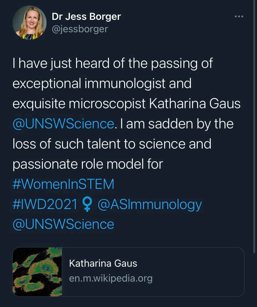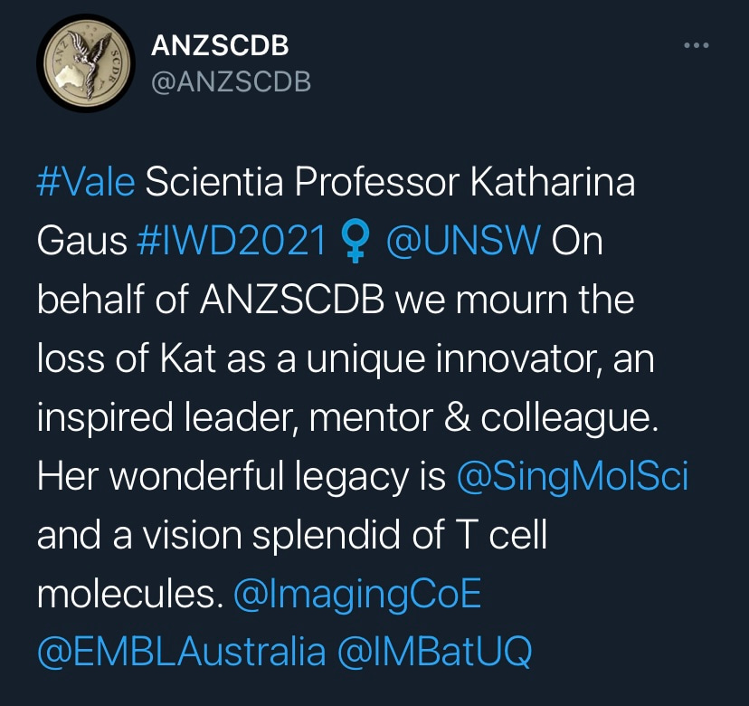 On March 3, 2021, the scientific community lost a bright star, Prof. Katharina Gaus. Prof. Gaus, or Kat as many knew her, was a brilliant scientist who made invaluable contributions in super-resolution microscopy and immunology. She was the type of methods developer who also pushed her tools to making new biological discoveries, and this love of both aspects of scientific advancement shows clearly in her body of published work and in the diverse interests of her former trainees.