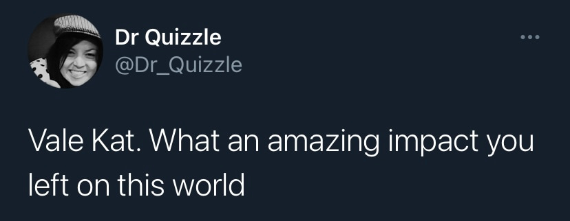 In short, Kat showed me that it was possible to be highly successful, passionate about your work, true to your core values and still have a sense of fun and adventure. She even made it look effortless. I will miss her greatly and always remember fondly the extraordinary, but far too short, time I spent in her mentorship.