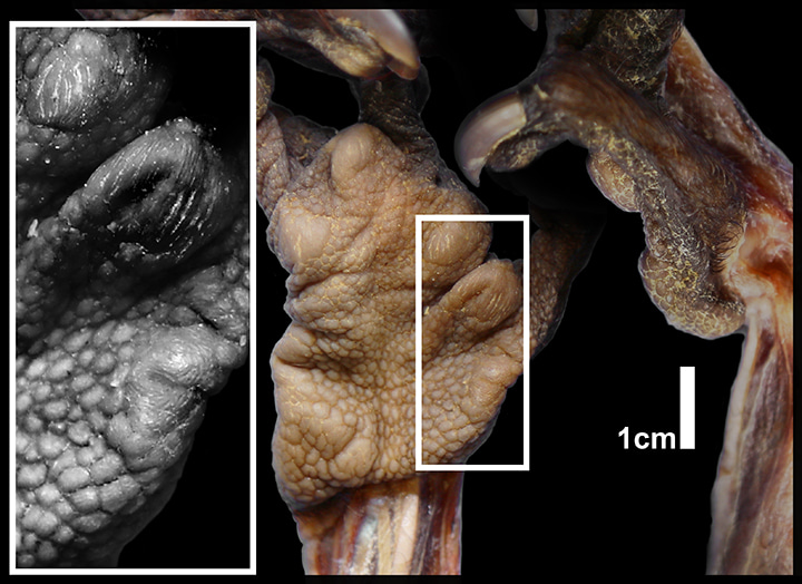 Decades later, I still study lemurs – their behavior and anatomy – and recently, I was able to dissect an aye-aye. There are only a couple of dozen of them in breeding colonies here in North America, and for a long time I had wanted to study those amazing hands myself. In the last few years, my students and I have dissected around 200 primates, studying their masticatory muscles and the adaptations of their forearms to various postures and modes of locomotion. What was initially most remarkable about the forearms of the aye-aye was how unremarkable they are; their muscles are more or less the same size, shape and configuration as all other lemurs their size. However, as we traced the tendon of one of these muscles down past the wrist and into the hand (most of the strength of fingers is actually produced by the muscles of the forearm), one of these tendons bifurcated and the smallest bit extended to a strange little structure near the thumb. As we examined the structure further, we noted a small bone and a cartilaginous extension that were moved in different directions by three different muscles. The little structure – what we realized was a “pseudothumb” – even had its own fingerprint! After scouring the literature for any reference to the structure – to no avail – and confirming its presence in six other specimens, we realized that we had found something that no one had ever noticed before: the aye-aye has an accessory digit on each hand – basically six fingers! (Maybe this is how the aye-ayes of Nosy Mangabe can climb sprawled on underside of branches?) Although this rare feature is found in a few other mammals (most famously, the panda), the aye-aye is the only primate to have a pseudothumb. Of course it is!
