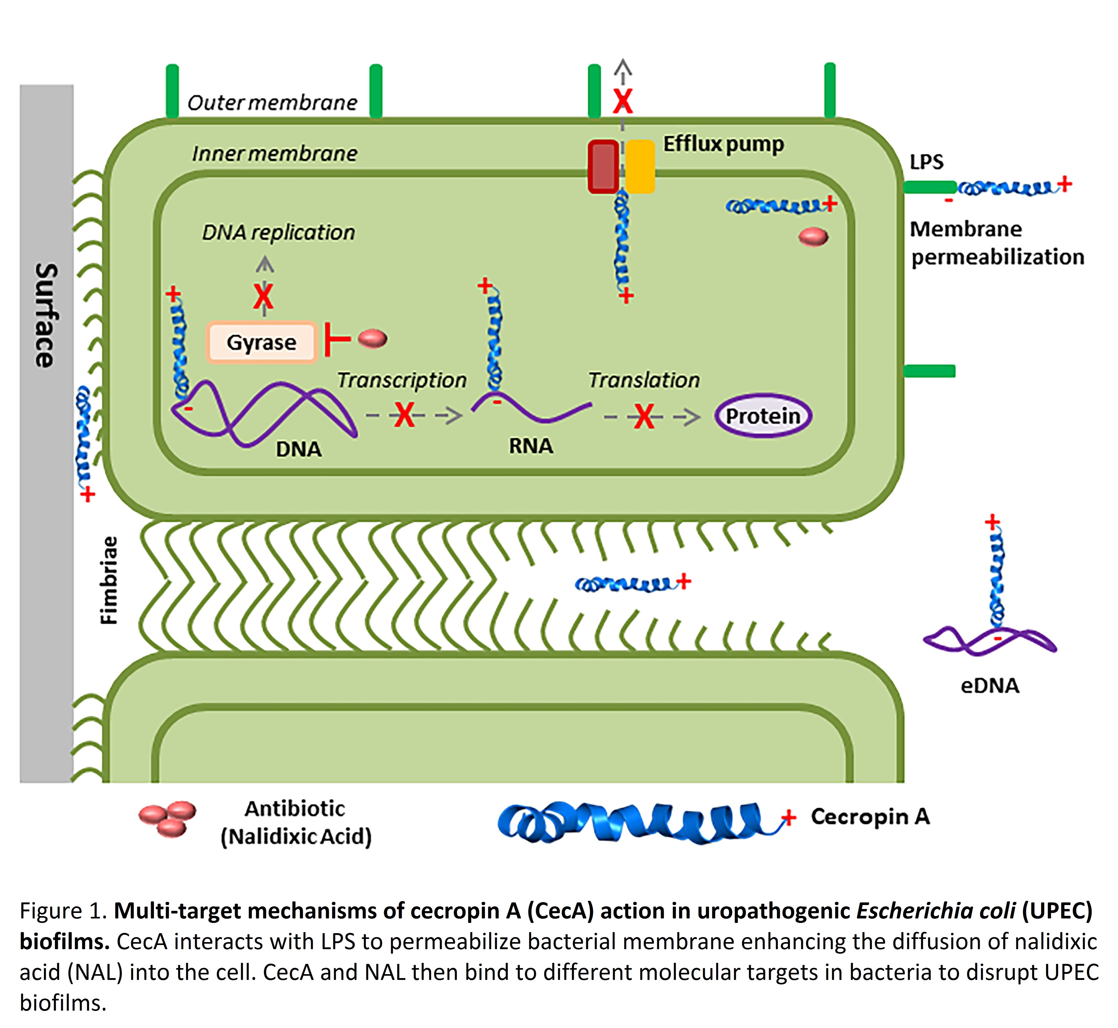 UPEC biofilms use multiple strategies to resist antibiotics, including extracellular appendages, impenetrable extracellular matrix (ECM), efflux pumps, and extracellular DNA (eDNA). We show that CecA either alone or in synergism with the antibiotic nalidixic acid can inhibit bacterial surface attachment, energy-dependent MDR efflux pumps and the release of eDNA (Figure 1). We conducted a serial passage experiment to report that these novel multi-target mechanisms of action ensure the slow emergence of resistance to the CecA + NAL combination. Our findings may pave the way for the development of new therapeutic strategies against UPEC and other biofilm-forming (multi-)resistant bacteria, using AMPs such as CecA alone or in concert with conventional antibiotics, inclusive of those no longer used as a monotherapy.