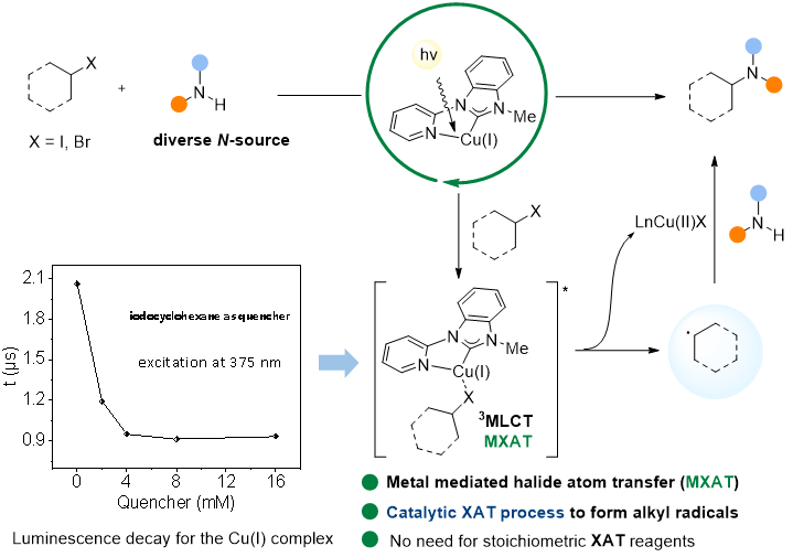this study, we present a pyridyl-carbene copper catalyst generated in situ that facilitates general C(sp3)-N couplings using unactivated alkyl iodides and diverse nitrogen nucleophiles. Mechanistic investigations indicate that the copper catalyst does not require binding to N-nucleophiles for light-harvesting, allowing for the compatibility of various nitrogen nucleophiles in the coupling process. The electron transfer mechanism is supported by the formation of alkyl radicals and Cu(II) complexes, as evidenced by radical trapping, radical clock, and EPR experiments.