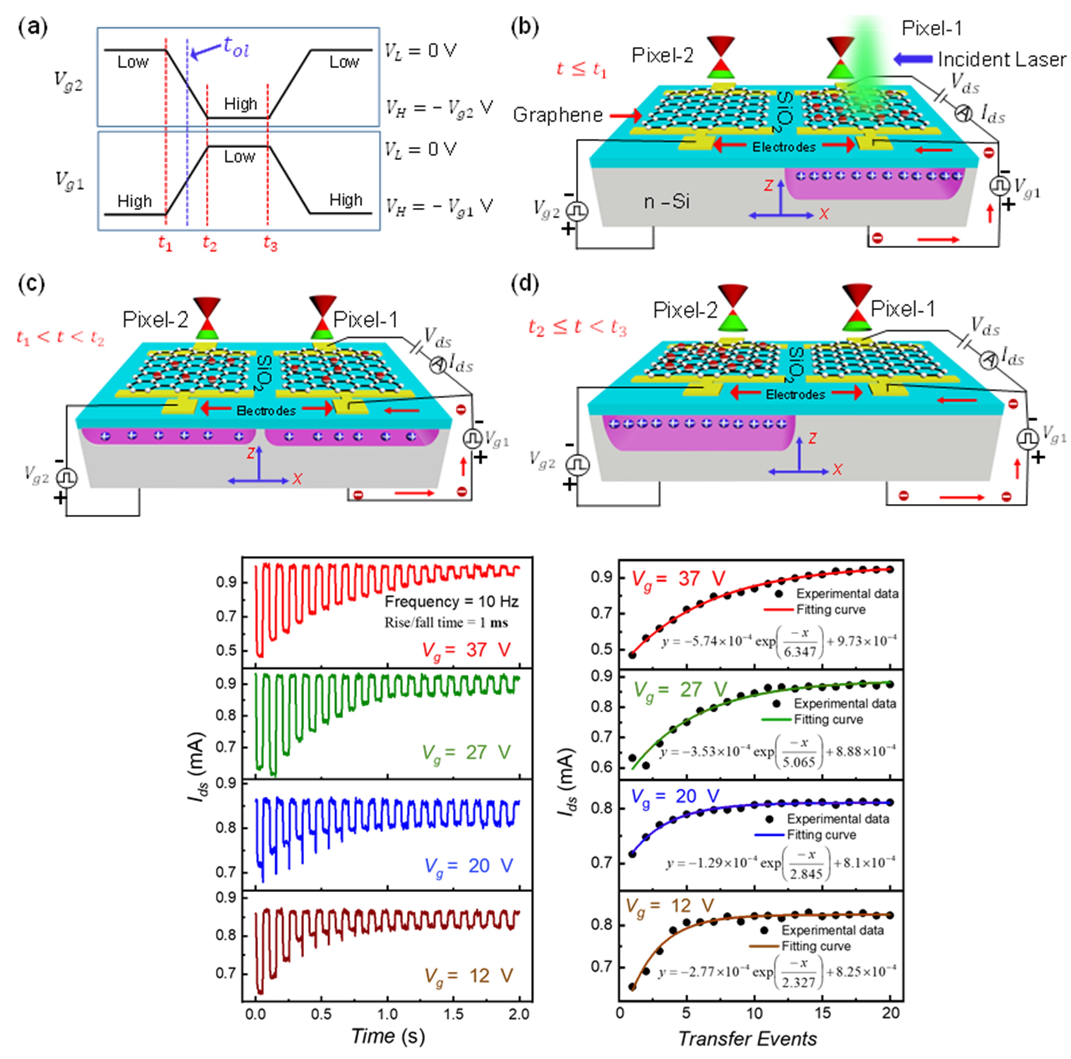 Parasitic capacitance often causes unwanted oscillations at the output of the circuit during the extended frequency operation of electronic devices. Whereas the operational frequencies of Vg1 and Vg2 reported in this work (10 Hz) are too low to cause any feedback loop. Another possible contribution of parasitic capacitance might originate from the proximity effect based on interpixel distance. However, the dimensions of our individual Gr-Si CCD pixels and corresponding interpixel distance (5 μm) are long enough to supress any such proximity effects to cause parasitic capacitance. Therefore, parasitic capacitance is not a dominating factor in our reciprocating charge transfer process.