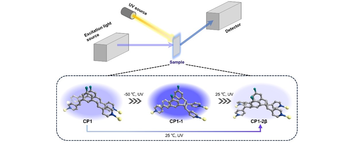 Fig. 1│Schematic diagram of in situ fluorescence spectroscopy and structures of the two-step [2+2] photocycloaddition transformation of CP1 to CP1-2β.