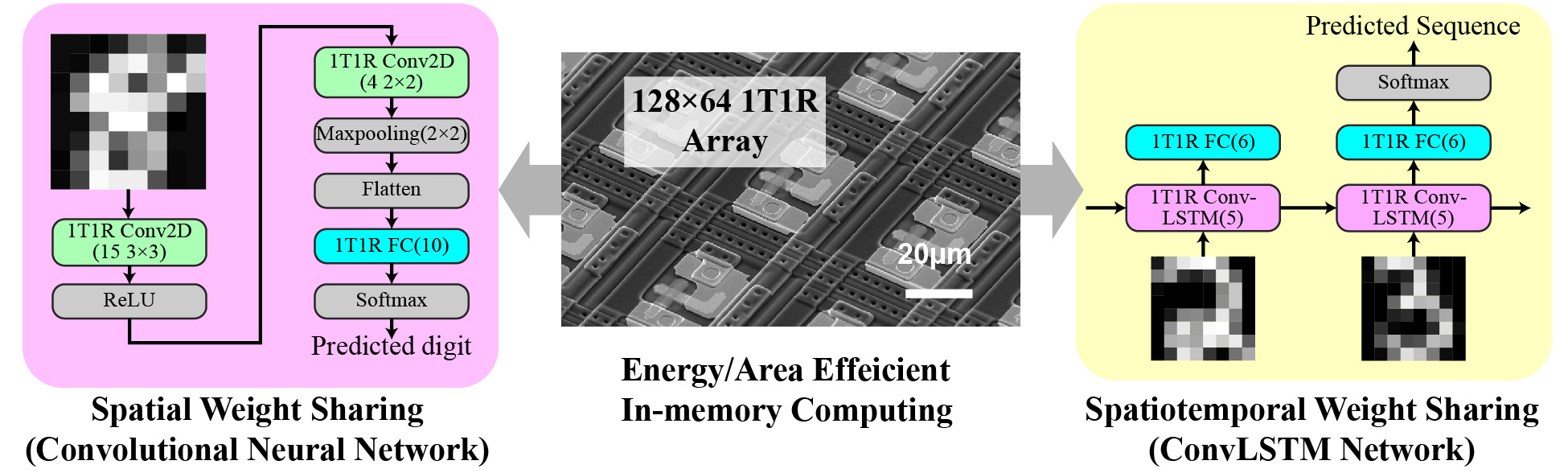 In this work, researchers from UMass Amherst, Hewlett Packard Labs, Syracuse University, Air Force Research Labs, Binghamton University, Tsinghua University, and Texas A&M University teamed up to implement the first in situ training of the convolutional neural network on a 128 × 64 1-transistor-1-memristor (1T1R) array. It was shown that the network could withstand the intrinsic hardware nonidealities with a simple dense mapping of convolution kernels to the memristor crossbar. The in situ trained memristor-based CNN correctly classified 92.13% of the MNIST hand-written digits using ~1000 weights, only a quarter of those of a fully connected memristor neural network with similar performance, thanks to the spatial weight sharing. In addition, we demonstrated the advantages of the weight sharing could be further extended by cascading the convolutional kernels in a recurrent convolutional long short-term memory (ConvLSTM) network. This first demonstration of memristor-based neural network with intrinsic spatiotemporal weight sharing was trained to classify a synthetic MNIST-sequence dataset with just 850 weights.