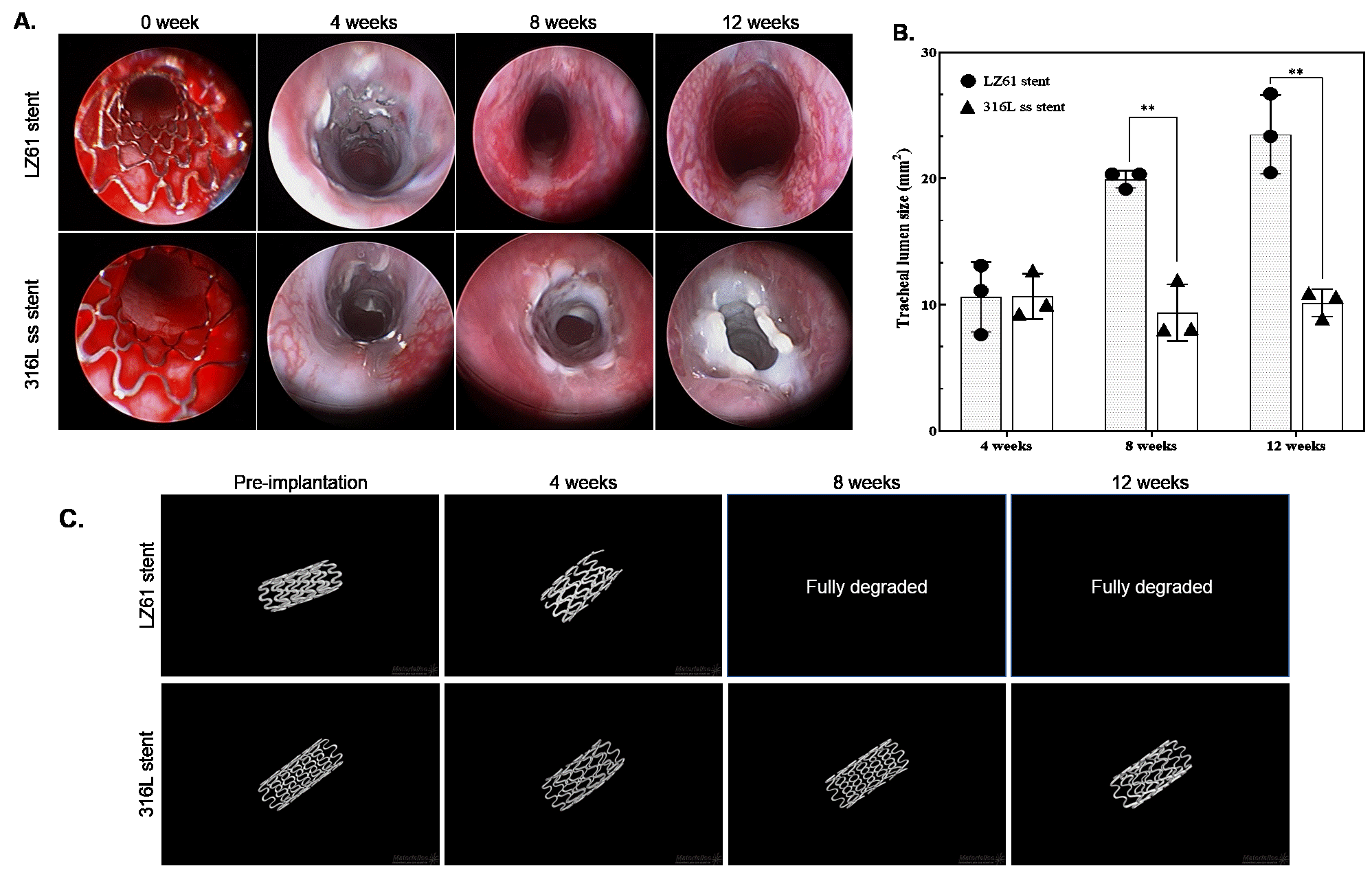 Fig. 1. (A). Endoscopic images of the stented airway right after implantation, and after 4, 8 and 12 weeks of implantation; (B). Tracheal lumen area calculated based on the cross-section of optical coherence tomography (OCT) images collected at 4, 8 and 12 weeks. **denotes a significant difference between alloy groups (p <0.01, n=3); (C). The 3D structures of 316L SS stents and LZ61-KBMS stents based on µCT scans collected at different time points indicating the stents remaining after implantation in vivo.