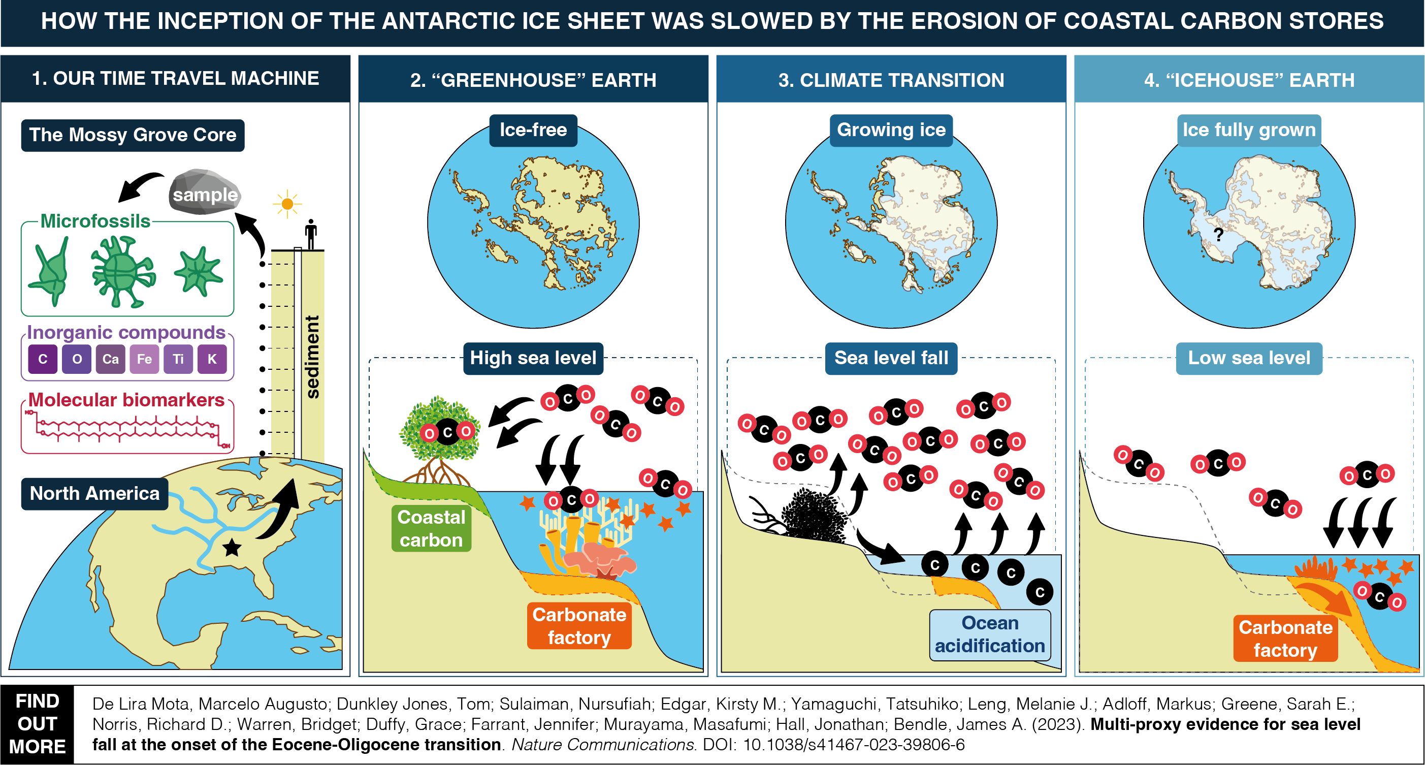 The team made up of scientists from six countries (Brazil, United Kingdom, Malaysia, Japan, Switzerland and the United States) examined the chemical composition and microfossil content of sedimentary rocks drilled in the central Mississippi, Gulf Coastal Plain, in the United States. Until today, it was believed that the emergence of an ice sheet in Antarctica took about 400,000 years, starting 34.1 million years ago, at the end of the Eocene epoch. This climate cooling was the end of the “Greenhouse” climate state that had persisted for more than 250 million years, including throughout the Mesozoic “age of the dinosaurs’. Since this first growth of ice sheets on Antarctica 34 million years ago they have been a persistent feature of our “modern” climate world. Understanding the climate conditions that promoted Antarctic ice sheet growth and allowed them to remain is a major focus of research. The new study revealed that the growth of the Antarctic Ice Sheet had already begun 34.4 million years ago, that is, 300,000 years earlier, but that it caused sea level fall and the erosion of coastal pools of organic carbon. This carbon was then likely broken down and released carbon dioxide to the atmosphere, preventing further global cooling and acting as a brake on rapid ice sheet growth. It was only once this organic carbon had been eroded and ‘used up’ that a rapid transition to the modern cold climate state took place.