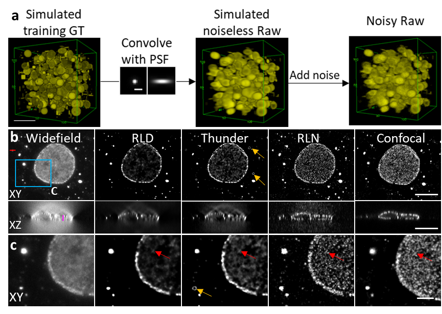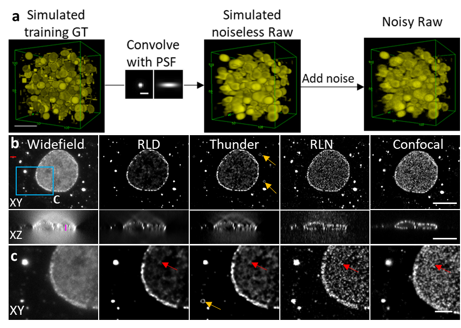 Figure 2. RLN trained with synthetic data can outperform RLD for datasets acquired by widefield microscopy. (a) Generation of synthetic data. (b) Lateral and axial planes of images of nuclear pore complexes in a fixed Cos-7 cell immunolabeled with primary mouse anti-Nup clone Mab414 and goat-anti-mouse IgG secondary antibody conjugated with Star635P, comparing widefield input, RLD with 100 iterations, Leica Thunder output, RLN prediction, and registered confocal data as a ground-truth reference. (c) Magnified views of the blue rectangle in (b). RLN was trained with synthetic mixed structures. Visual analysis (e.g., red arrows) demonstrate that RLN restoration outperforms Thunder (obvious artifacts indicated by orange arrows) and RLD in both lateral and axial views, showing detail that approaches the confocal reference. Scalebar: (a) 5 μm; (b) 10 μm; (c) 3 μm.