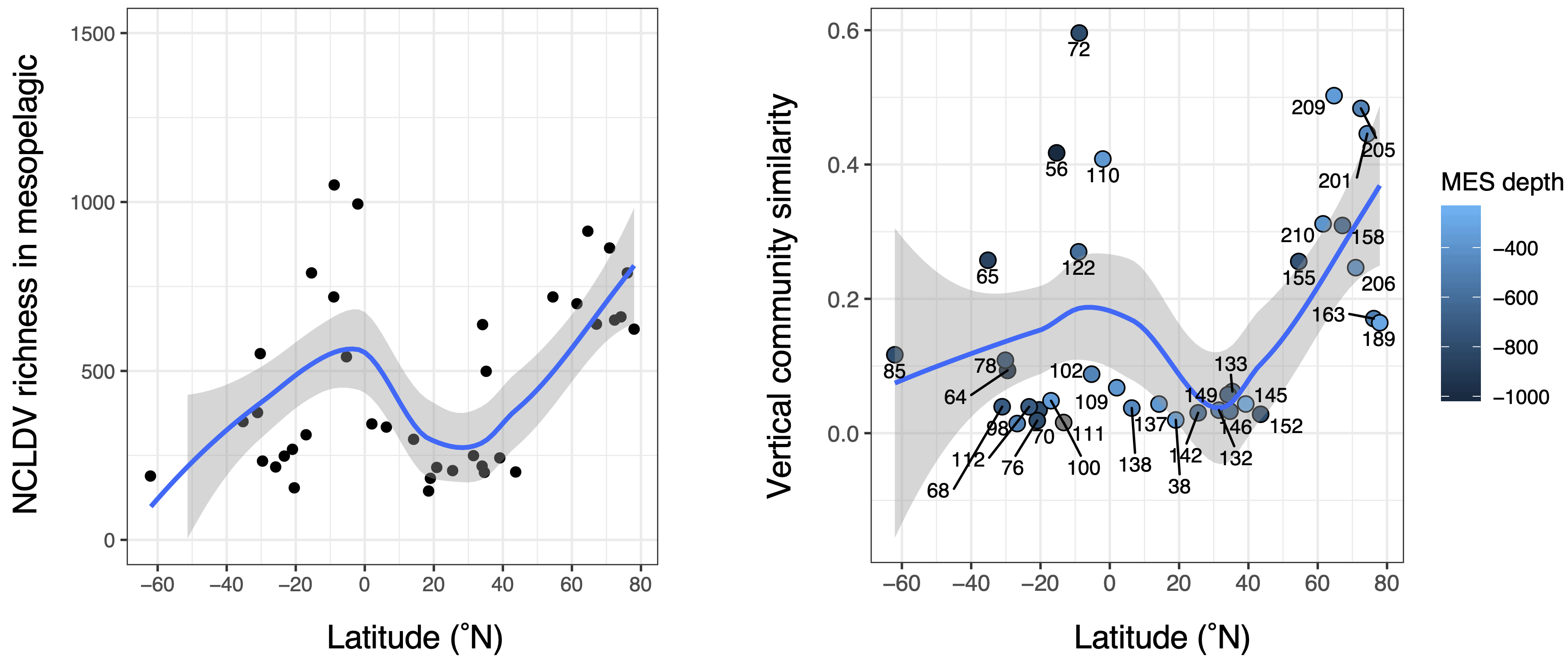 Latitudinal variations of (left) NCLDV richness in the mesopelagic layer and (right) NCLDV community similarity between the surface and mesopelagic layers (with the station numbers). The unexpected similarity between the two different plots helped to make a story of our manuscript.