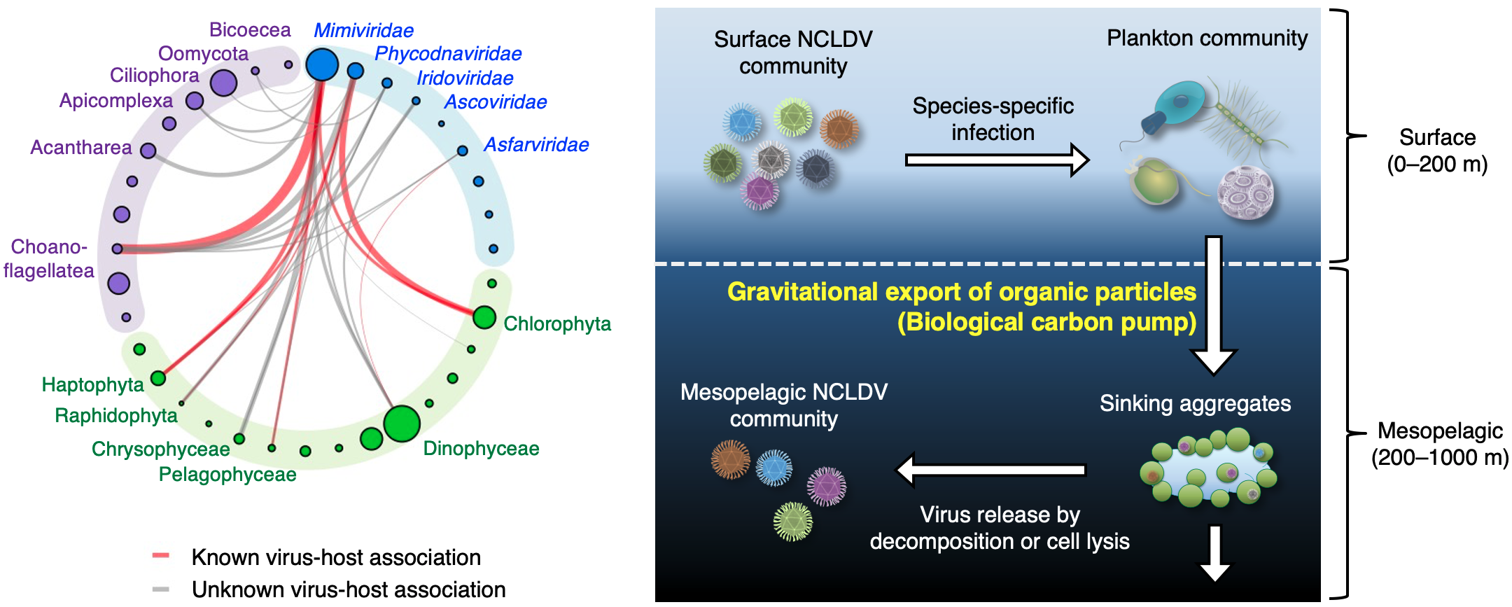 In a recent paper published in Nature Ecology & Evolution, we used large-scale pole-to-pole metagenomic data derived from the Tara Oceans expedition to investigate the distribution of giant viruses across size fractions, depths, and biomes. Our analyses revealed that diverse NCLDV phylotypes are ubiquitously distributed over the global oceans, although an elevated proportion of unique (“endemic”) phylotypes was detected in the Arctic Ocean. The community structures of NCLDV were highly dependent on those of a variety of eukaryotic lineages, suggesting tight interplays between viruses and microeukaryotes. We also observed high similarities of NCLDV community between the surface and aphotic mesopelagic layers in some productive areas, despite the lack of vertical mixing. The high vertical connectivity was accompanied by the increase of NCLDV richness in the mesopelagic zone. These results suggest that surface viruses are exported to mesopelagic layers presumably by attaching to cellular debris. Overall, our study highlights the potential importance of interactions between giant viruses and eukaryotes in forming biogeochemical processes in the ocean.