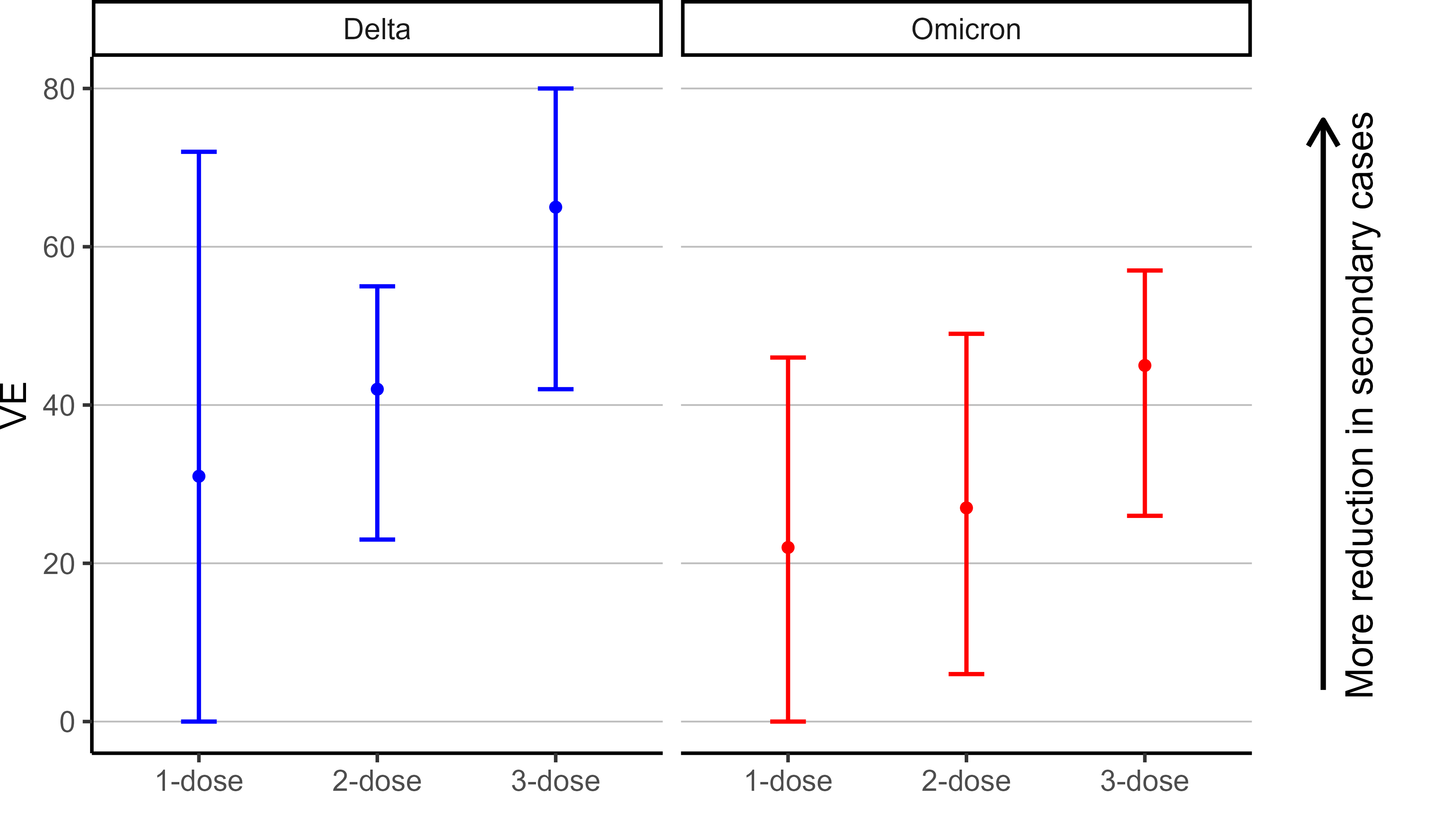 Another story can be read if we instead stratify by the vaccine status of the contacts, as shown in Figure 4. The VE for both Omicron and Delta increases as the number of vaccine doses increases, even though the VE are in general lower for Omicron than Delta.