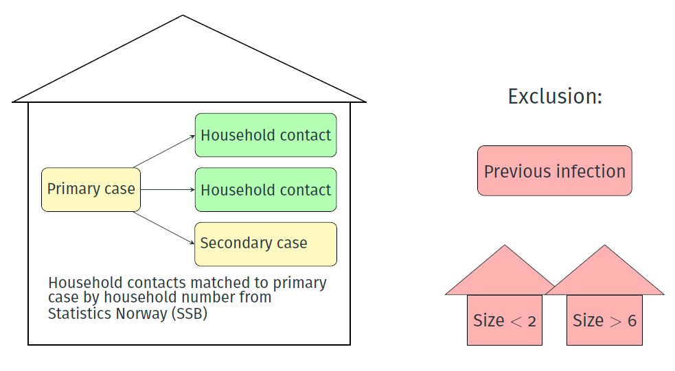 We had access to contact tracing data through the Norwegian Pandemic Preparedness Registry, Beredt C19 [1]. Contact tracing is in Norway carried out through phone interviews performed by trained health personnel. First, we identified primary cases in the data. A primary case was defined as a positive case who were not listed as anyone’s contact. This is then the person that initiated the contact tracing in the household. Traced contacts with matching household number to their primary case were then extracted, as illustrated in Figure 1. The study period was December 14, 2021 until January 23, 2022. We only included primary cases until January 13, 2022, to ensure a 10-day exposure of all contacts. The resulting data set consisted of 2169 household contacts (60% Omicron households and 40% Delta households).