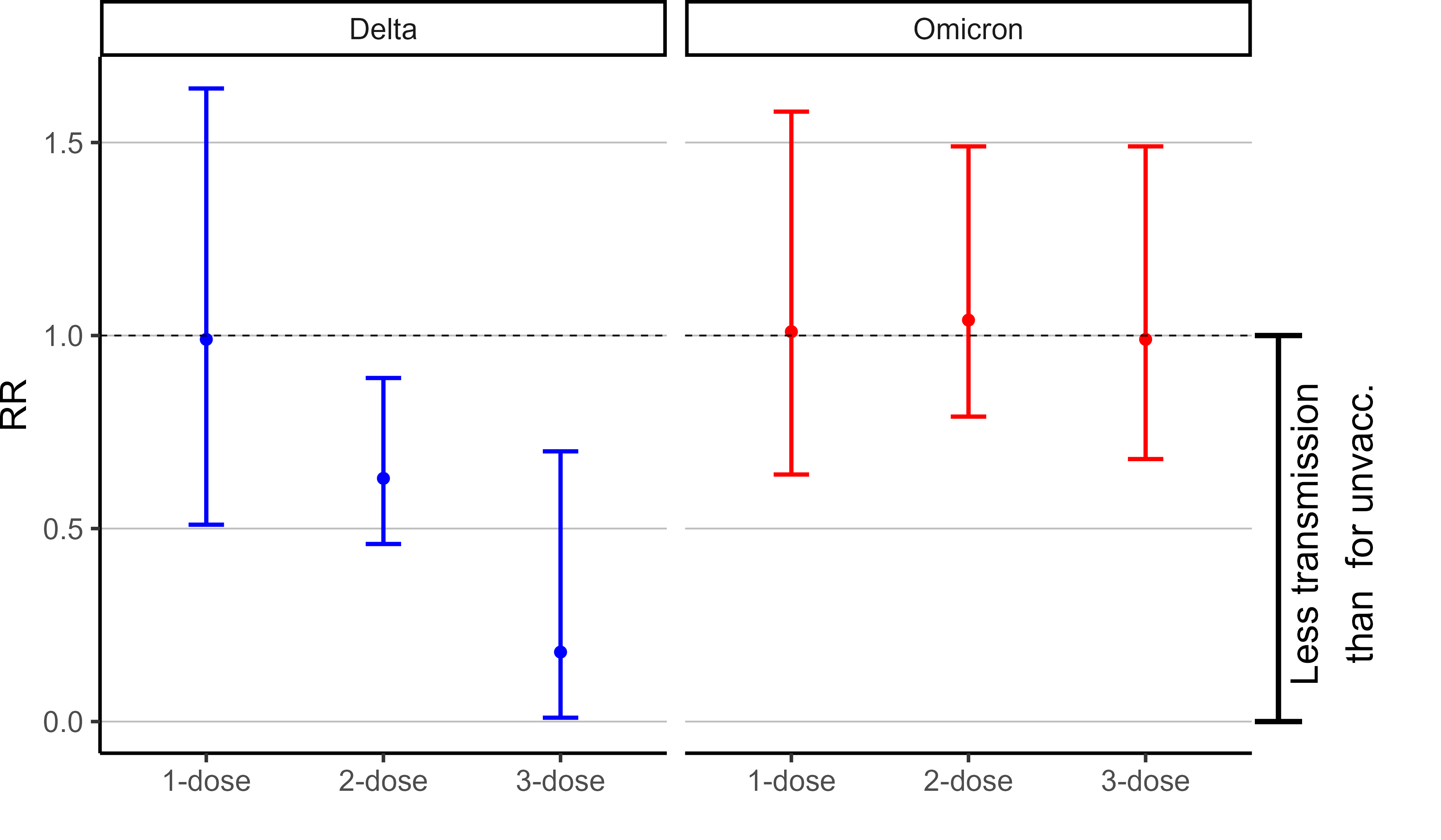 Figure 3. Risk ratio (RR) of transmission, for the different vaccination groups compared to the unvaccinated group, for Omicron and Delta variants separately.