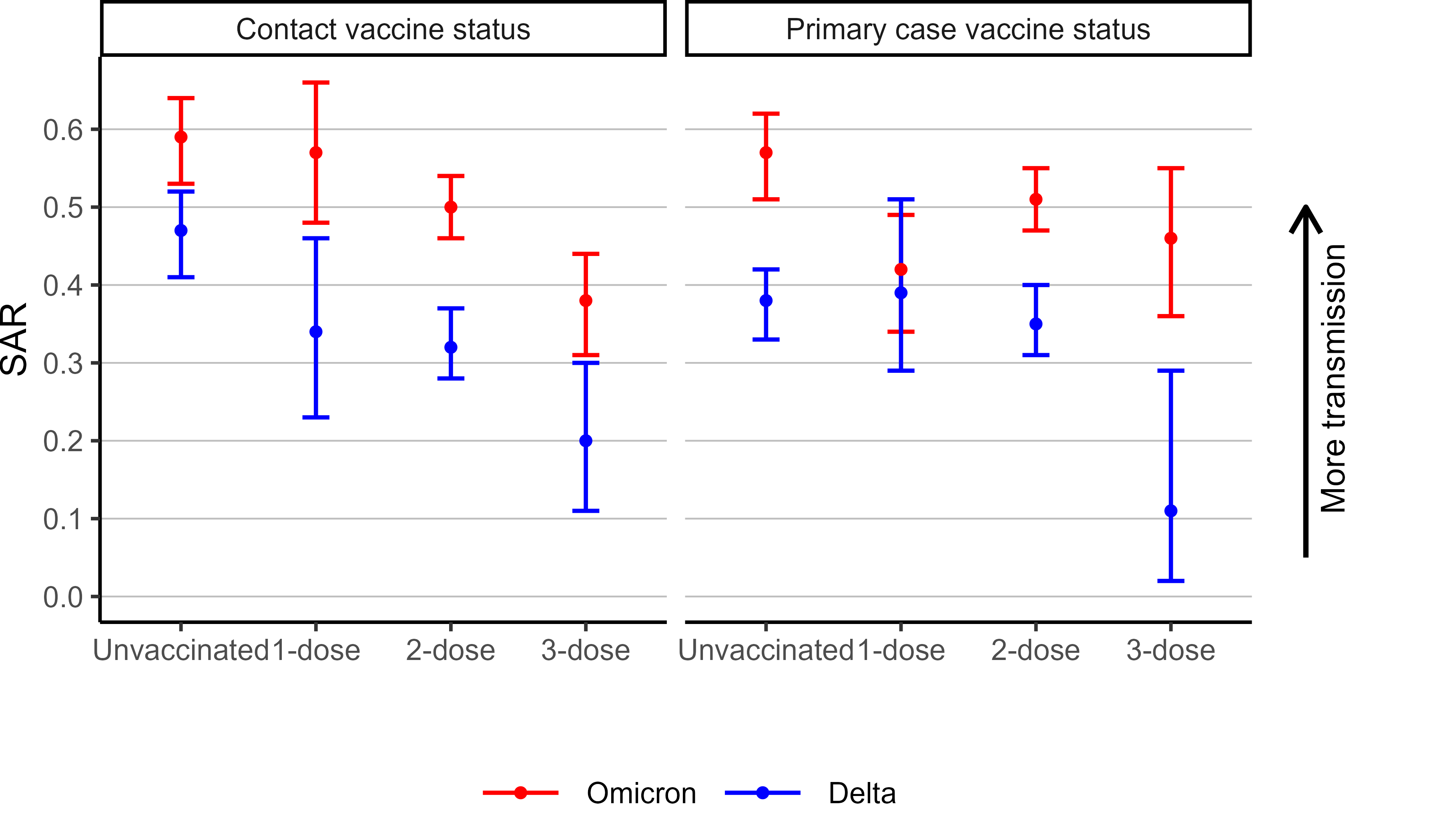 Not surprisingly, we found a higher overall 10-day household secondary attack rate (SAR) of Omicron compared to Delta. Furthermore, when conditioning on the vaccine status of either the primary cases or the contacts, the Omicron variant had a significantly higher risk of both transmission and infection compared to Delta, as seen in Figure 2.