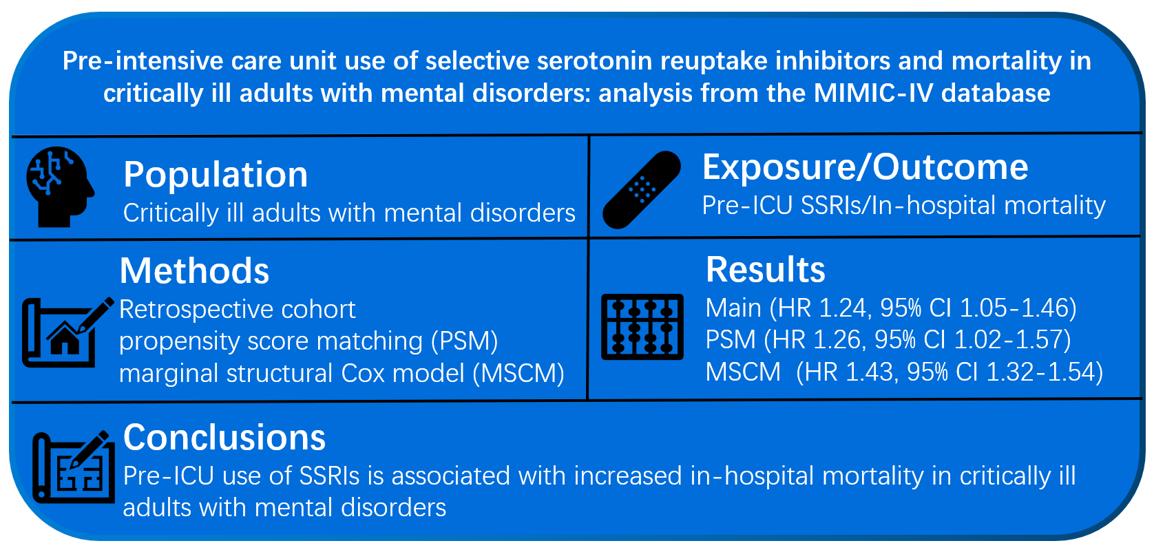Mental disorders are common in critically ill patients and are associated with unfavorable outcomes. Mental disorders are typically treated with antidepressants and/or antipsychotics. Of these, selective serotonin reuptake inhibitors (SSRIs) are the first-line pharmacological treatments, with approximately one in five critically ill patients receiving them before ICU admission. In 2014, a retrospective study found that the use of SSRIs prior to ICU admission was associated with increased in-hospital mortality in critically ill patients [Chest 2014;145:745-752].