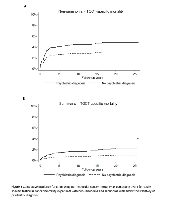 Furthermore, we found a worse TGCT prognosis among patients with history of psychiatric disorders. This is important to keep in mind, suggesting that one may need to be extra observant in providing these patients with the same opportunities to being successively treated, cured and followed for their TGCT.