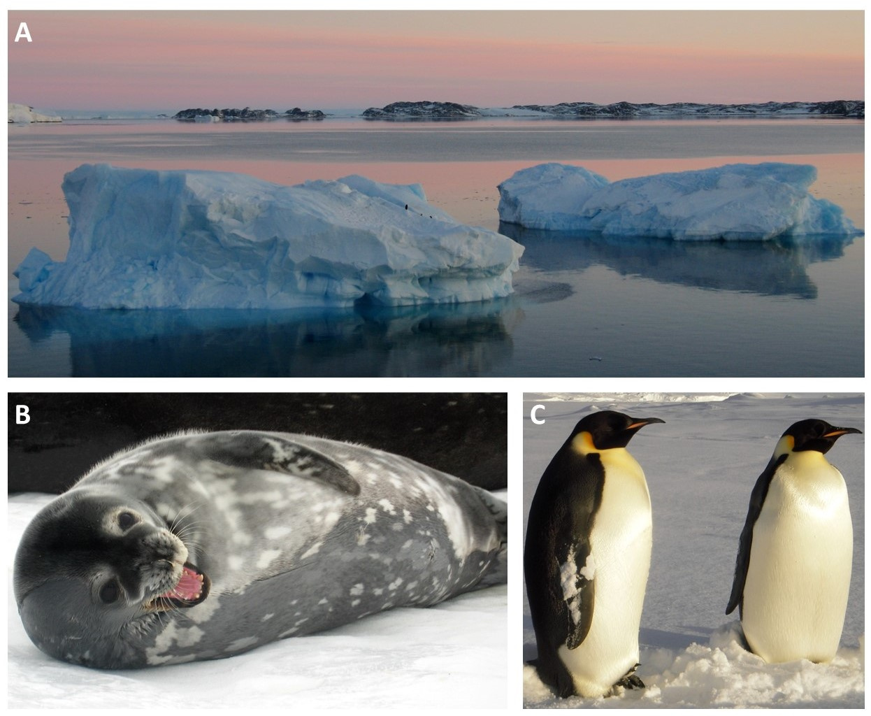 Figure 1. A) Image of a coastal bay. Coastal bay environments provide critically important feeding areas for many marine mammals that live on the fast ice, including Weddell seals (B) and emperor penguins (C). (Photo credit: Nicole Hill)
