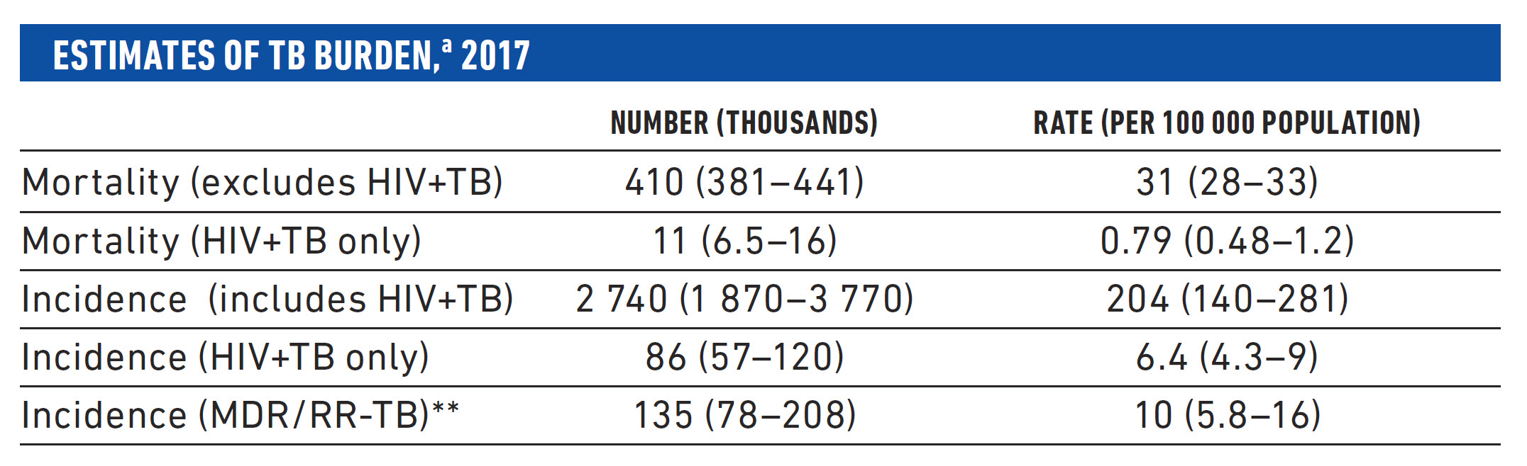 Drug-resistance continues to be a concern in India. An estimated 65,000 people were estimated to have either multi-drug resistance (MDR), or rifampicin-resistance.TB treatment coverage (which is notified/estimated incidence)in 2017 was only 65%. This means too many people are falling through the cracks and not getting adequate treatment.