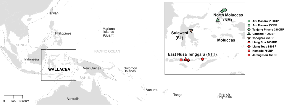 The islands of Southeast Asia are one of the most multifaceted regions on our planet. Always isolated from both Sahul, the Pleistocene Australia-New Guinea landmass, and Sunda - comprising of Southeast Asia and Western Indonesia - even during the Last Glacial Maximum, the Wallacean islands have been crucial for the evolution and distribution of local fauna and flora as well as the expansion of early hominins. Despite the challenges of early sea crossing, multiple archaic human groups including Homo erectus and Homo floresiensis are found in Wallacea1, while cave paintings suggest that anatomically modern humans have inhabited the islands for at least 45.5 thousand years2. The next known large event affecting Wallacea was the “Austronesian expansion”, where groups with advanced sailing and farming techniques departed from Taiwan 4 to 5 thousand years ago to settle in Wallacea, New Guinea and the Oceanian islands3. These groups spoke Austronesian languages which are widespread in the region today, but the survival of some Papuan languages, presumably spoken by earlier hunter-gatherers, indicates that both groups co-existed or mixed and contributed to the linguistic and cultural diversity we see today. Previous genetic studies of modern-day inhabitants have identified Papuan-related and Austronesian-related ancestries, but have yielded conflicting dates for this intermixing, ranging from 1,100 to nearly 5,000 years ago. Archaeological finds from the early Metal Age also demonstrate that the people were highly mobile and engaged in long-distance trade with Mainland Southeast Asia (MSEA) and India long before the European arrival and exploitation of the region.