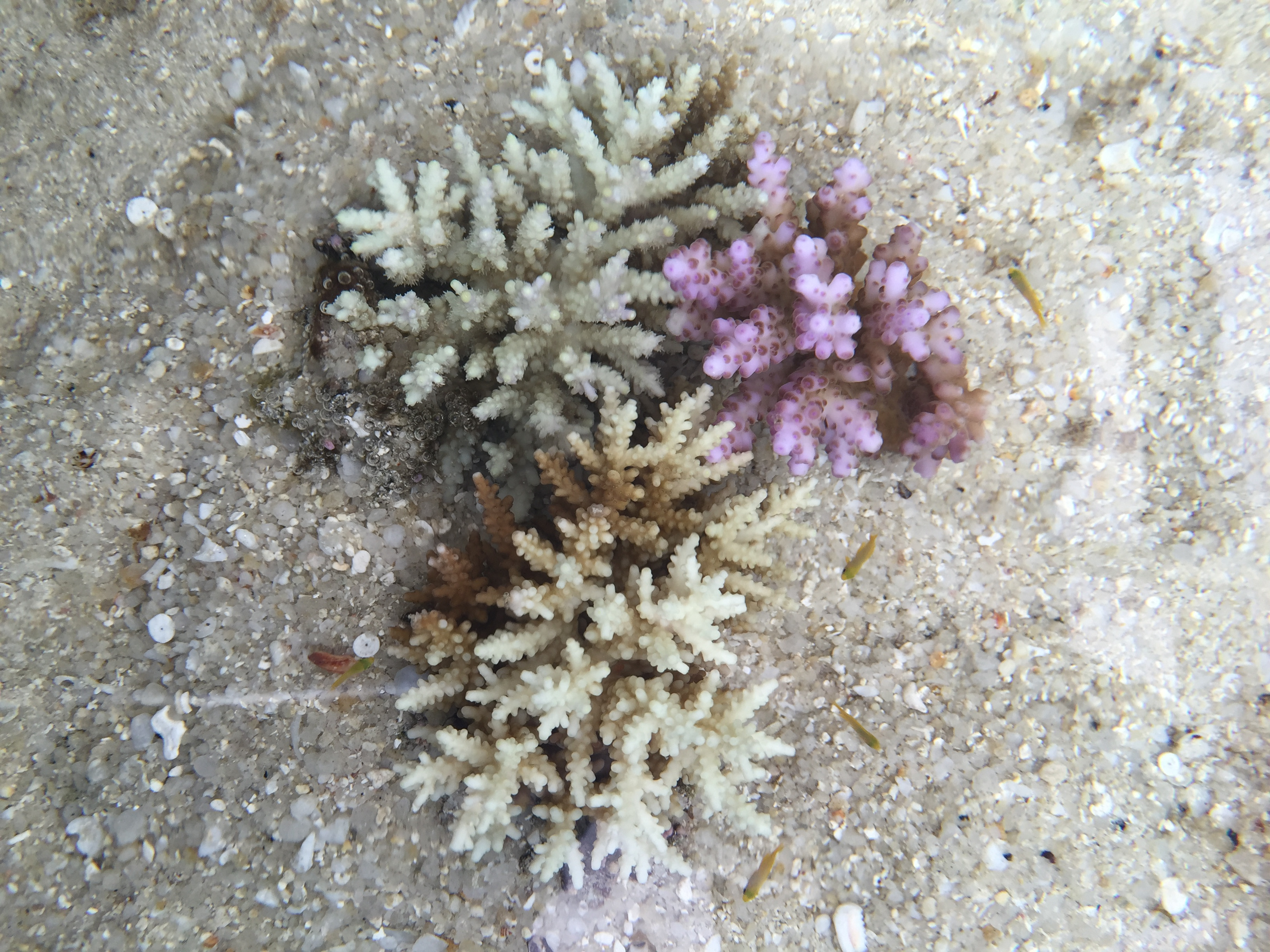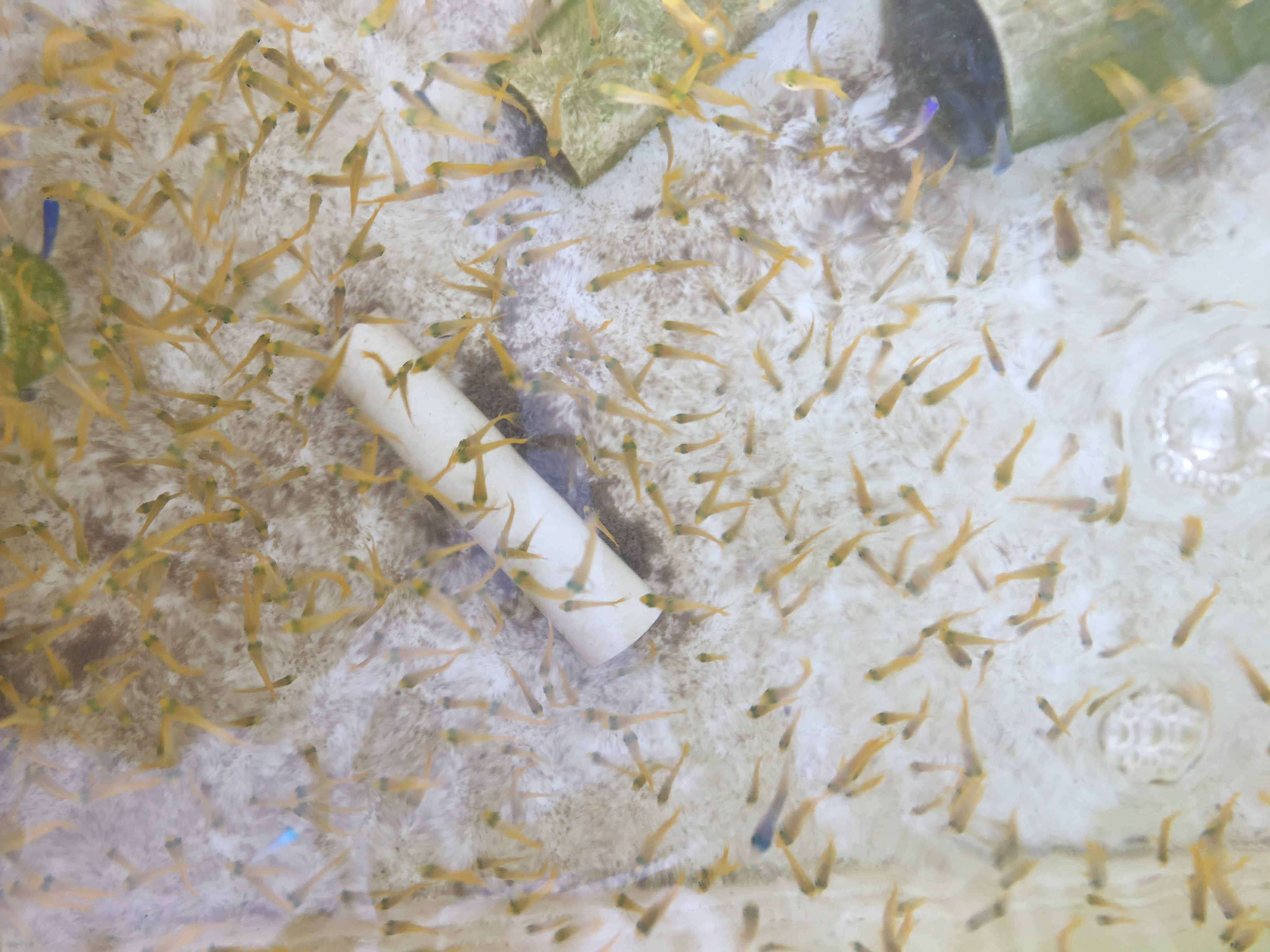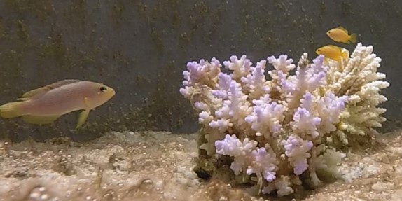 Figure 5: A close up of larval coral reef fishes settled on a healthy coral reef habitat within the mesocosm