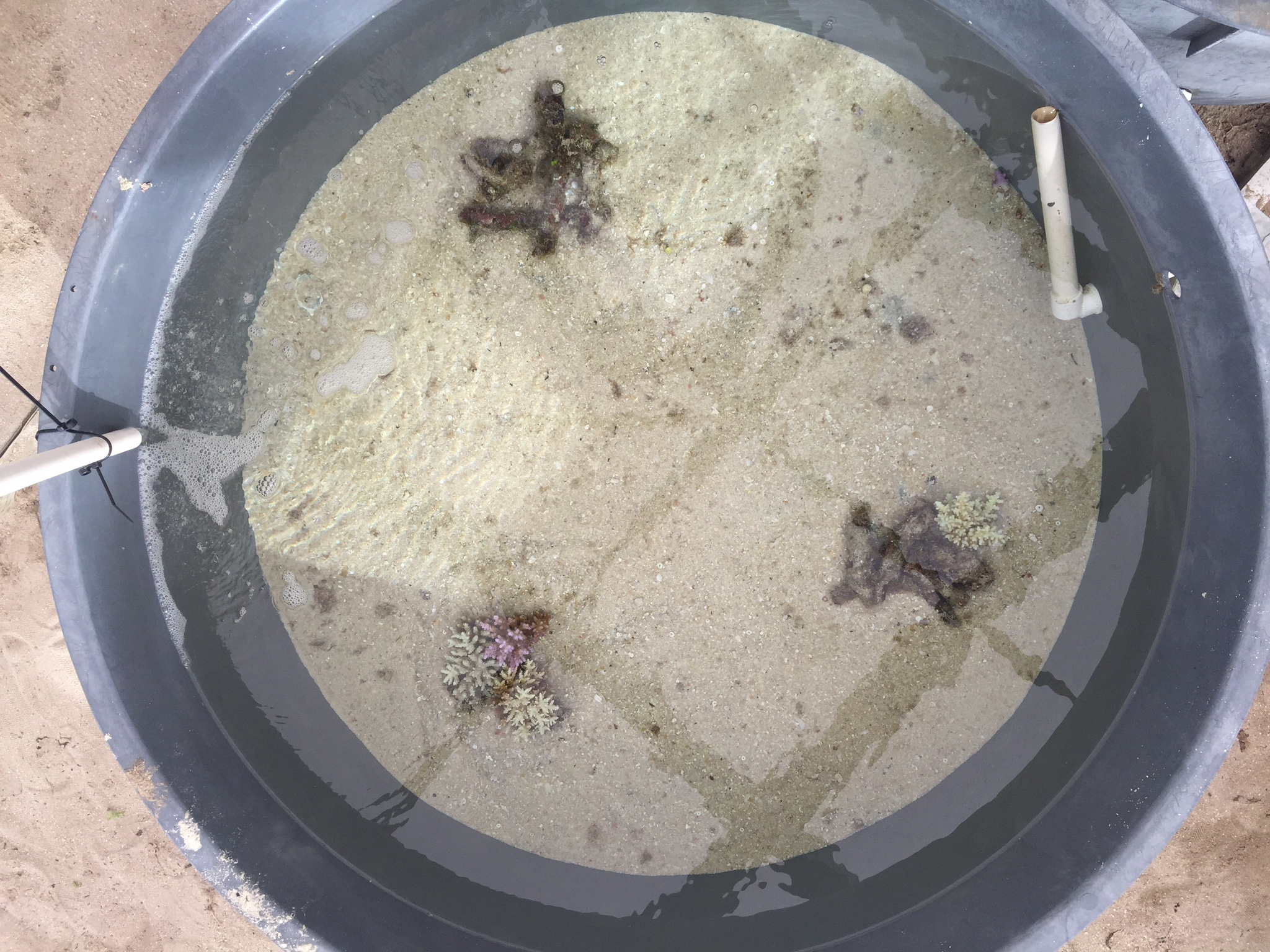 Figure 4: A top down view of a mesocosm containing one healthy, one intermediate, and one degraded coral reef habitat, divided by sand.