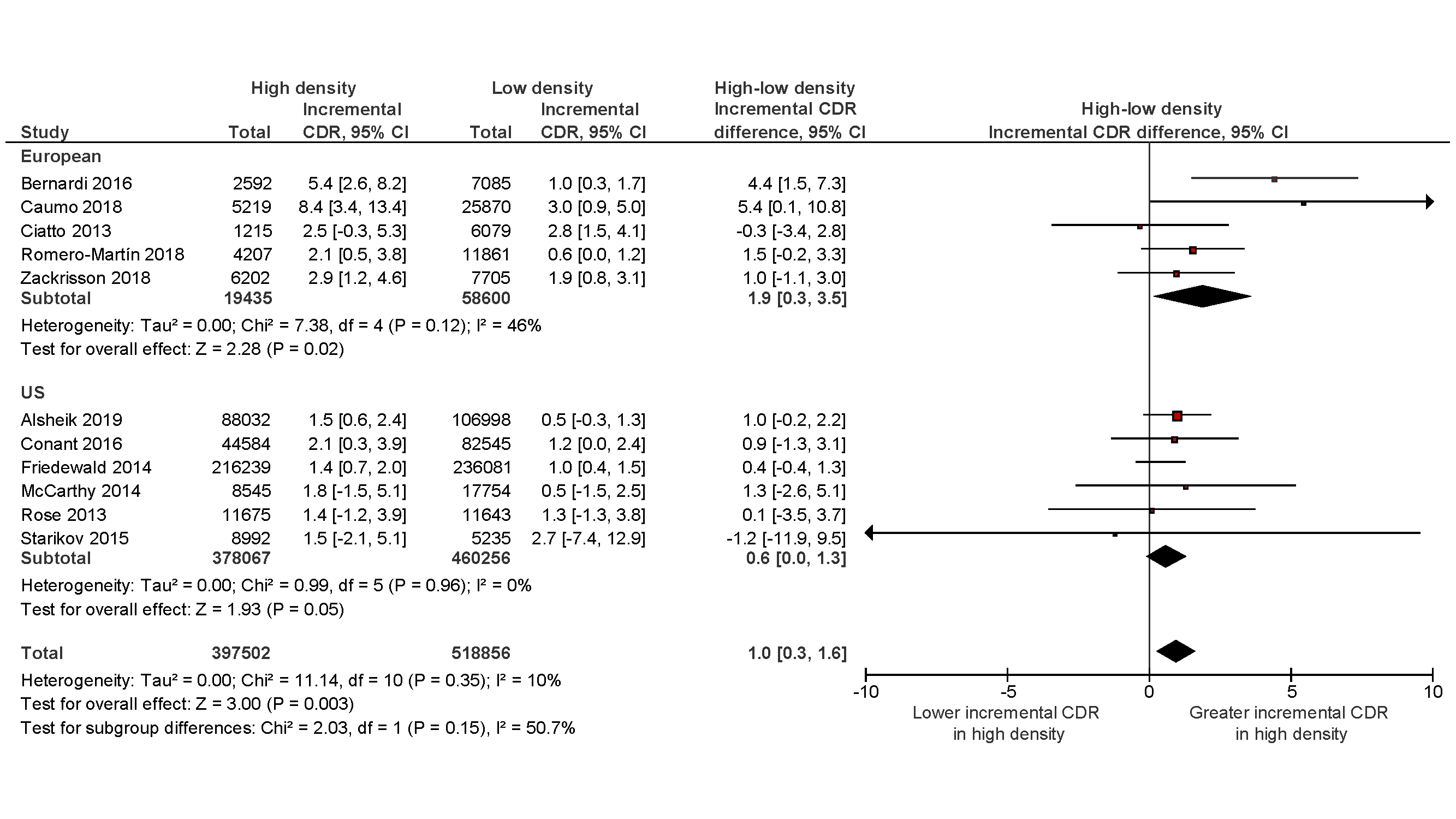 Figure 1: Difference in cancer detection rate (incremental CDR) between 3D mammography and 2D mammography stratified by breast density and study setting.