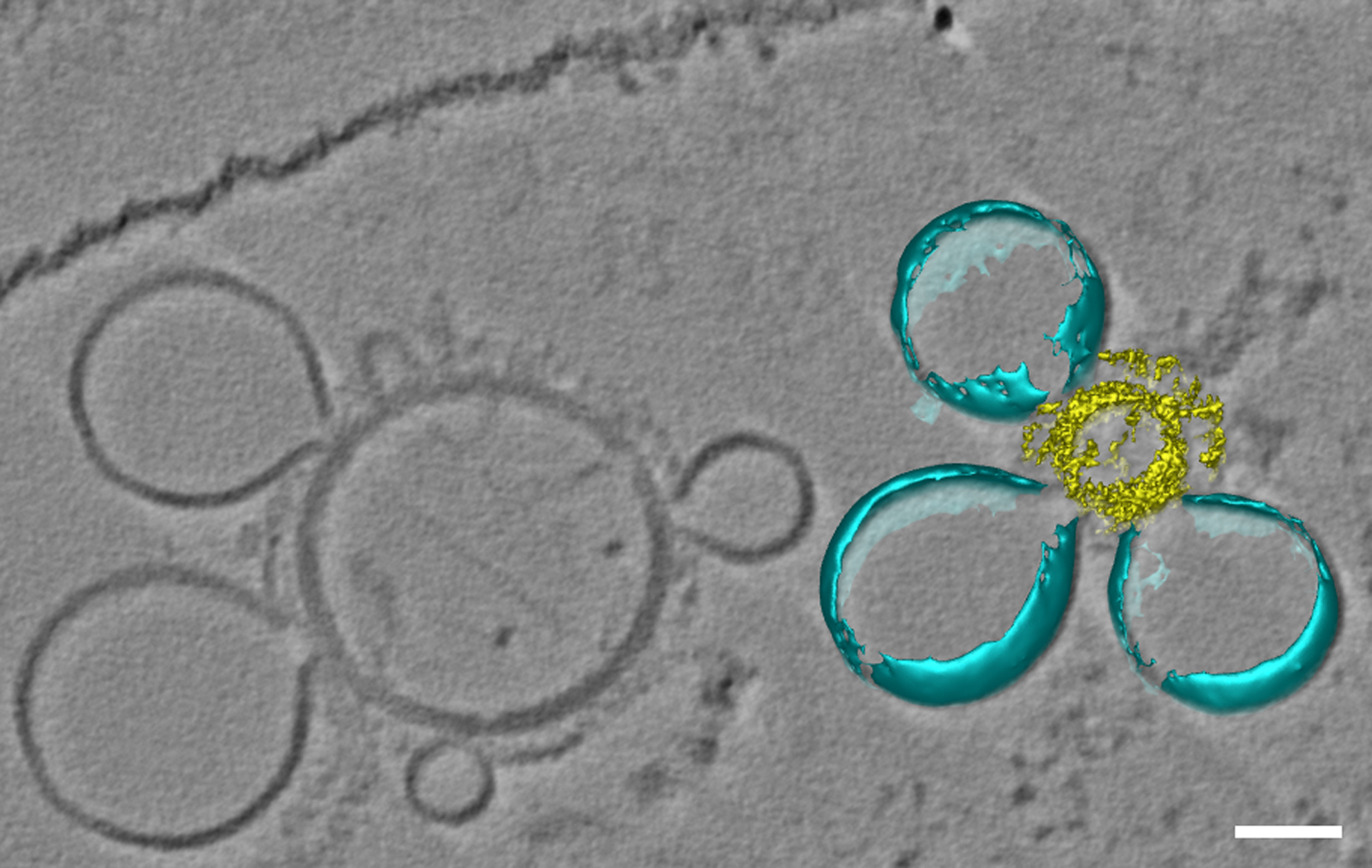 Cryo-electron tomography using Volta phase plate allows imaging in 3D with high signal-to-noise ration and close to focus. At low cholesterol concentration the liposomal membrane (cyan) ruptures and is inserted in the influenza A virus-like particle (yellow) forming a hemifusion diaphragm with large diameter (~20nm). Scale bar: 50 nm.