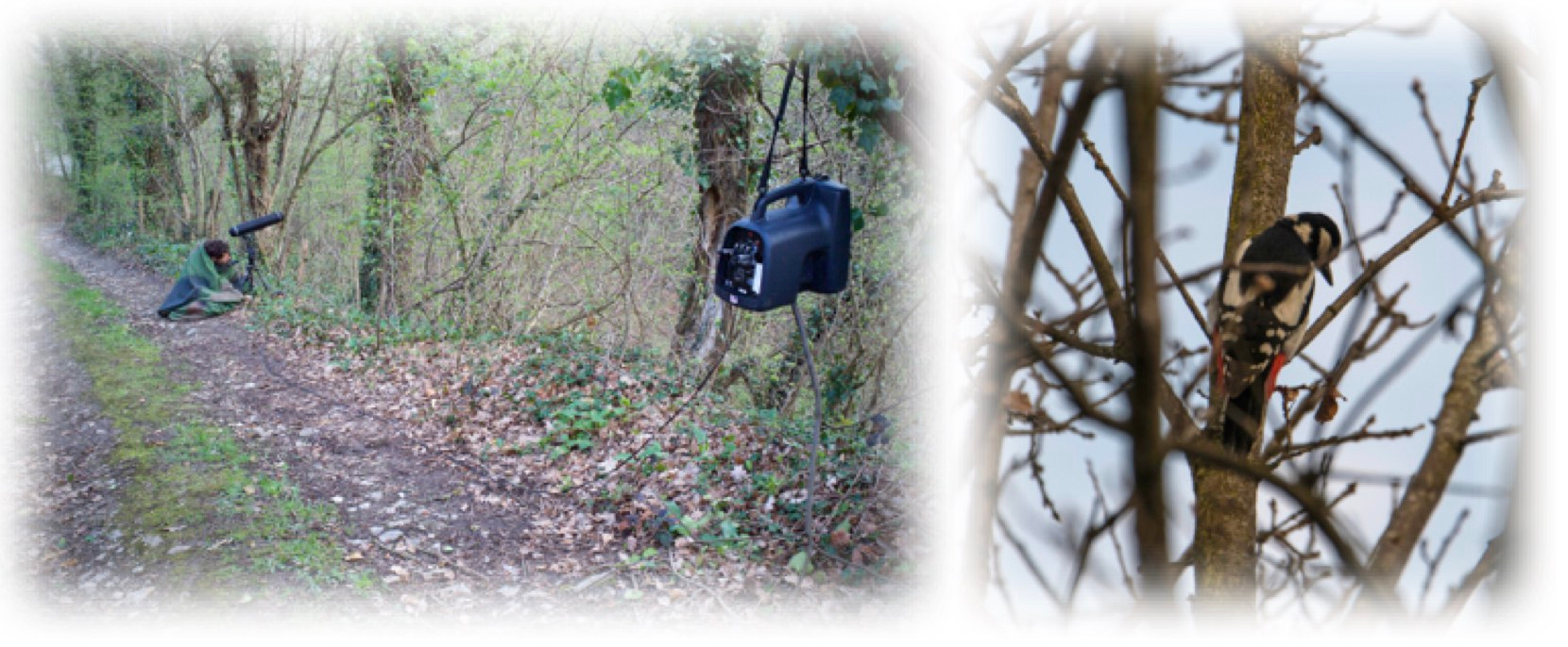 Left: Maxime underneath a camouflage net, performing an acoustic playback experiment on a great spotted woodpecker (the loudspeaker is attached on a branch and hangs 1m above ground). Right: Great spotted woodpecker that approached the speaker. Photo credits: A. Blanc (ENES team).