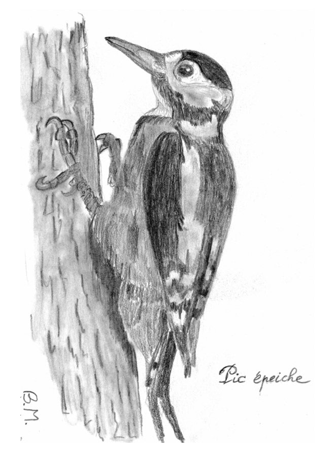Great spotted woodpecker Dendrocopos major, the key species which allowed us to experimentally test our hypotheses. Drawing credits: B. Mathevon.