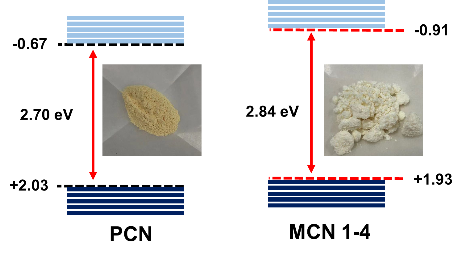 Fig. 1 photographs and bandgap structure of PCN and MCN1-4.