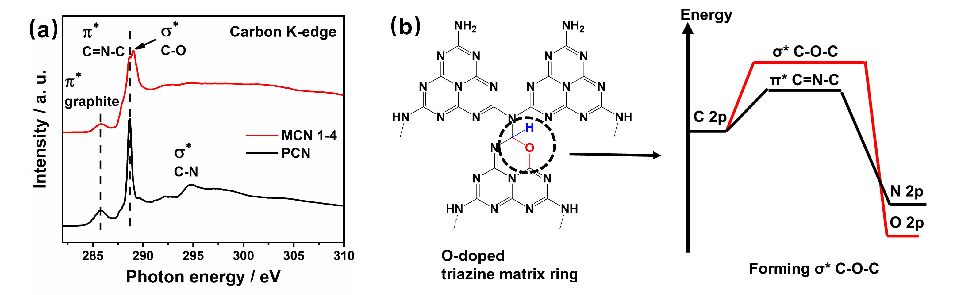 According to the NEXAFS characterization (Fig. 2), MCN1-4 has a new peak at 289.1 eV, which is attributed to the σ*C-O of the C-O-C part of the triazine matrix ring. The orbital energy of σ* C-O (289.1 eV) in MCN1-4 is 0.4 eV higher than that of π* C=N-C (288.7 eV). Generally, the σ* orbital energy is too high to participate in the photocatalytic reaction under visible light irradiation. However, σ*C-O has appropriate energy, and the photoexcited electrons are transferred to this orbit to obtain a longer lifetime than any π* orbital.
