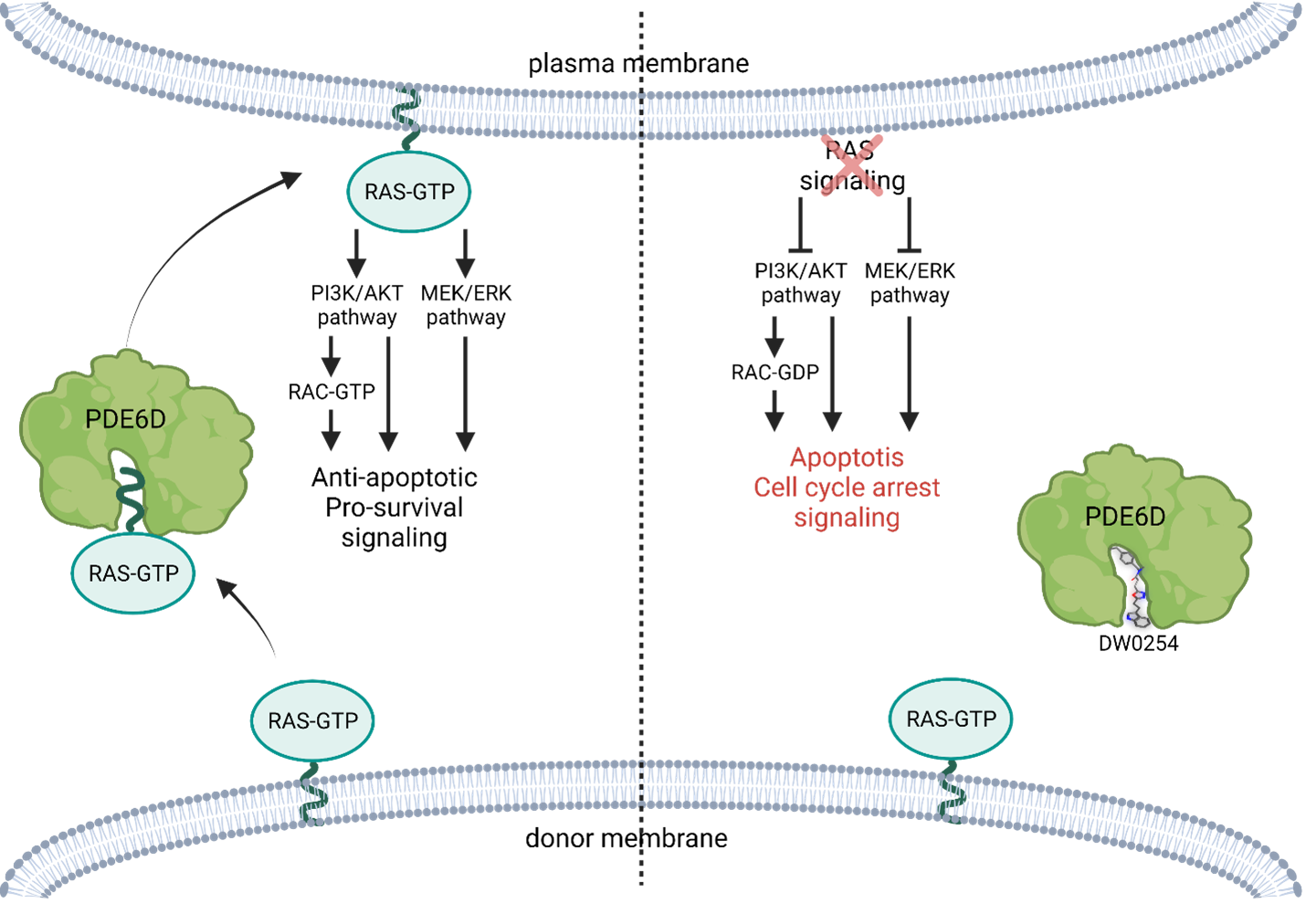 Firstly, we developed a photoprobe consisting of DW0254 covalently linked to a minimalist terminal propargyl-diazirine photocrosslinker, referred to as PAL. The PAL-linked probe possessed antiproliferation properties consistent with those of its parent compound, demonstrating that the photoprobe retained activity and was cell-permeable. Using cellular photoaffinity labeling methods combined with label-free quantitative mass spectrometry analysis (PAL-MS) we identified retinal rhodopsin-sensitive cGMP 3',5'-cyclic phosphodiester 6 subunit delta (PDE6D) as a target hit. PDE6D acts as a carrier for prenylated cargo including RAS. These prenylated proteins remain soluble in the aqueous environment of the cytosol only with the help of chaperones. PDE6D specifically sequesters GTP-RAS farnesyl residue in its hydrophobic pocket and helps in transporting it to the plasma membrane where it activates downstream signaling pathways.