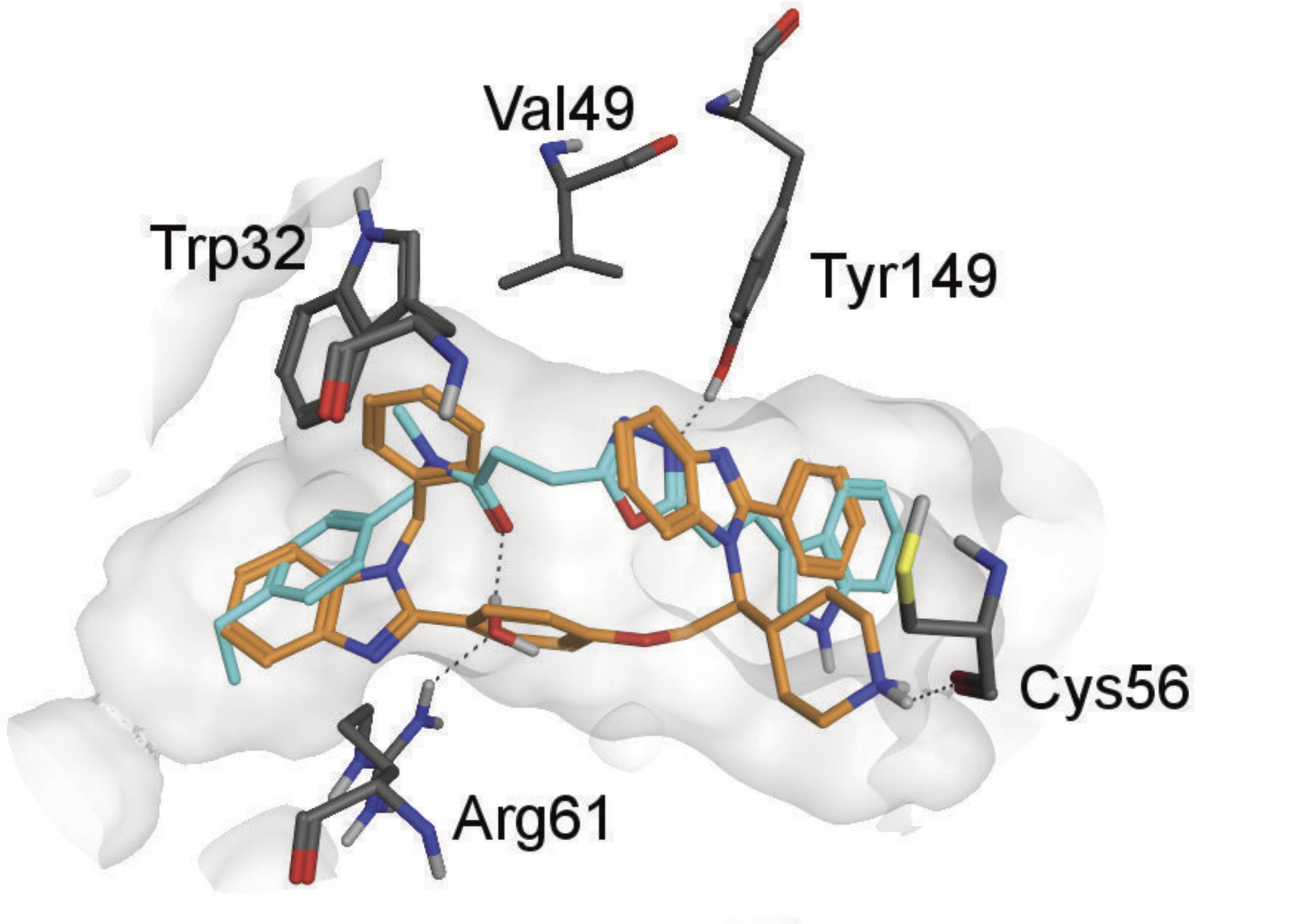 Figure 1: Experimental binding mode of DW-0254 (cyan) in wild-type PDE6D superposed with Deltarasin (orange) binding mode. Several binding site residues, including V49, are shown for reference.