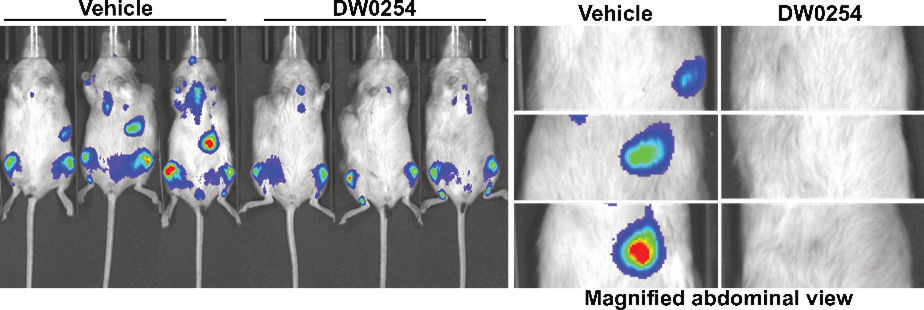 Figure 3: Bioluminescent images of day 24 post-transplant of mice treated with DW0254 or Vehicle pumps from day 7 to day 21 and magnified abdominal view.