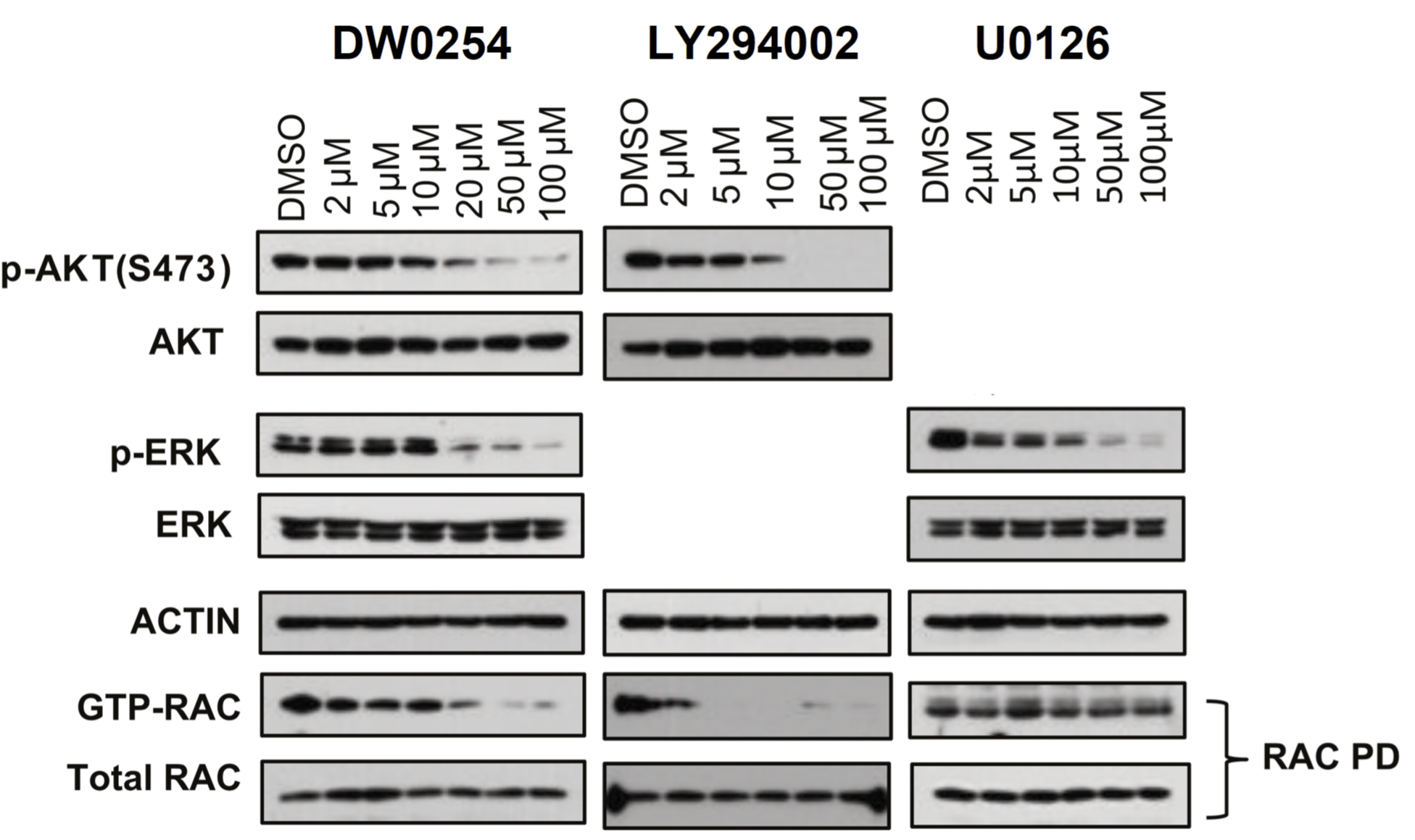 Figure 2: Levels of AKT, ERK, and RAC activation upon treatment with increasing doses of DW0254, LY294002, or U0126.