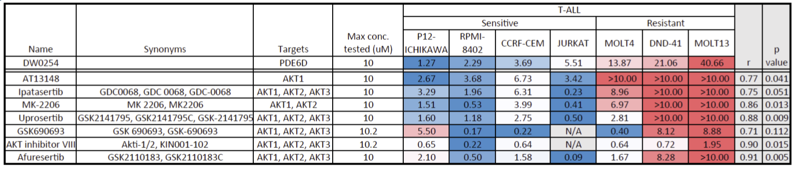 Table 1: Response to AKT inhibitors in T-ALL cell lines from “The Genomics of Drug Sensitivity in Cancer Project” database compared to sensitivity to DW0254. Pearson’s correlation coefficient (r) and the p-value for the correlation coefficient between response to DW0254 and each AKT inhibitor are shown on the right extremity.